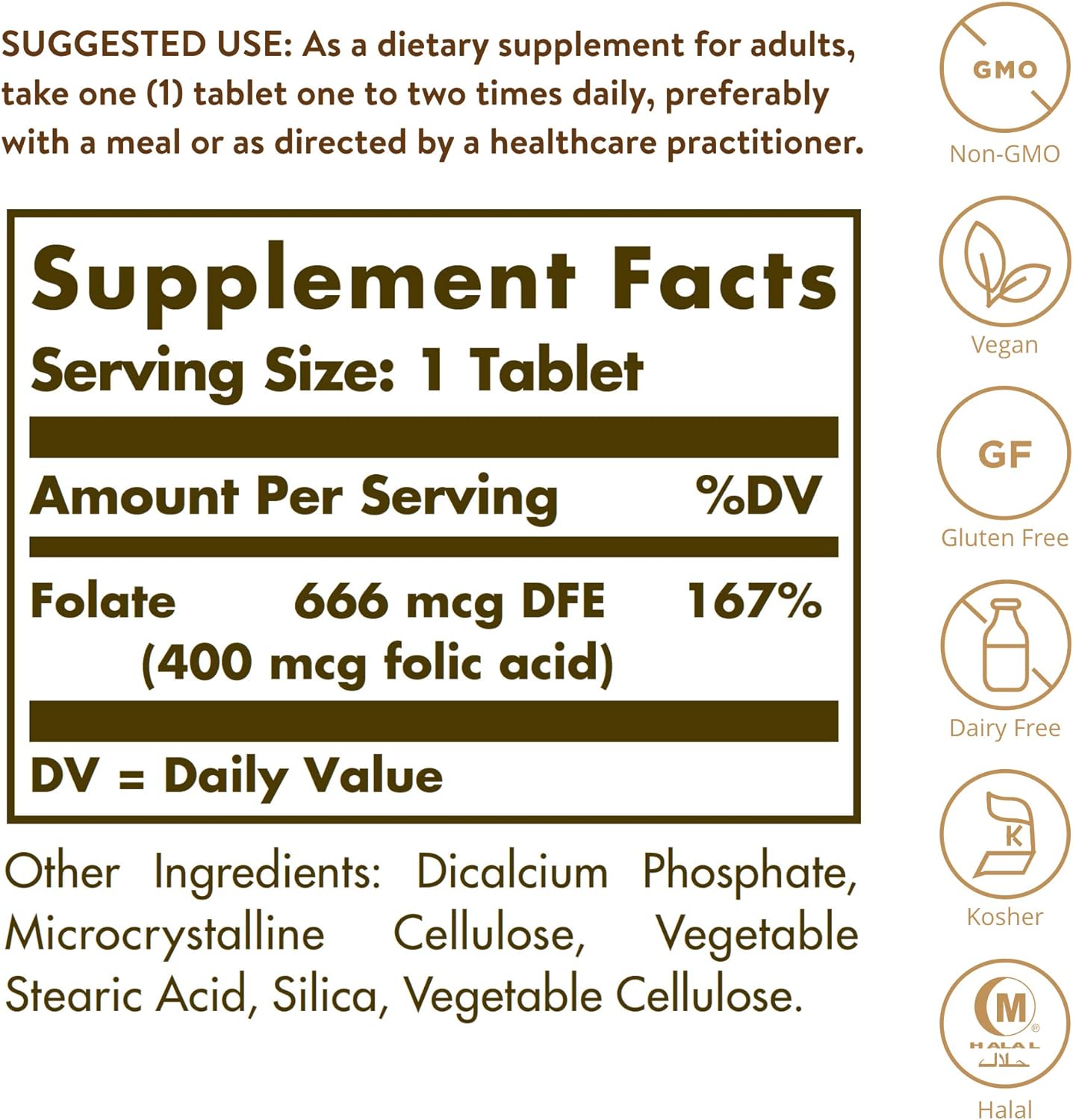 DESCRIPTION : SOLGAR Folate 666 mcg DFE (400 mcg Folic Acid), 250 Tablets - Pack of 2 - Heart Health - Prenatal Support - Non-GMO, Vegan, Gluten Free, Dairy Free, Kosher - 500 Total Servings
