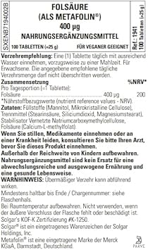Product Description Solgar Folate (as Metafolin), the body ready form of Folic Acid, is a B Vitamin and contributes to several processes within the body, with the most well-known one its support of maternal tissue growth during pregnancy. Folic acid is a supplement which is advised to take by pregnant women and those trying to conceive. It can be found in different foods, such as dark green leafy vegetables, but to make sure you reach the adequate level of intake, especially before and after conception, taking a supplement is highly recommended. Low folic acid levels have been proven a risk factor in the development of neural defects in the developing foetus. 1-3 tablets of SolgarFolate (as Metafolin) 400 µg will contribute to: • Maternal tissue growth during pregnancy • Normal amino acid synthesis • Normal blood formation • Normal homocysteine metabolism • Normal psychological function • Normal function of the immune system • Reduction of tiredness and fatigue • The process of cell division All Solgar products meet our industry recognized “Gold Standard” for excellence. Made using naturally sourced ingredients and innovating since 1947, Solgar is your perfect supplement to good health – 98% of Solgar consumers recommend the brand* *Global Praxis online shopper survey 2017, which included 3,882 VMS consumers. Food supplements should not be used instead of a varied balanced diet and a healthy lifestyle. Ingredients Each tablet provides: Bulking Agents: mannitol, microcrystalline cellulose, Anti-caking Agents: vegetable stearic acid, silicon dioxide, vegetable magnesium stearate, Crosslinked Cellulose Gum, Folate (as calcium-L-methylfolate as Metafolin) 400µg (200%*). *EC NRV = EC Nutrient Reference Value. P.when('A').execute(function(A) { A.on('a:expander:toggle_description:toggle:collapse', function(data) { window.scroll(0, data.expander.$expander[0].offsetTop-100); }); }); Directions As a food supplement for adults, one (1) tablet daily, preferably at mealtime, or as directed by a healthcare practitioner. Do not exceed directions for use. Storage information: Store at Room Temperature Safety Warning If you are pregnant, nursing, taking any medications or have any medical condition, please consult your healthcare practitioner before taking this product. Food Supplements should not be used as a substitute for a varied diet. Store out of the reach of young children. Box Contains Glass jar containing 100 Tablets Manufacturer Contact Information Solgar UK, Beggars Lane, Aldbury, Tring, Herts HP23 5PT See more