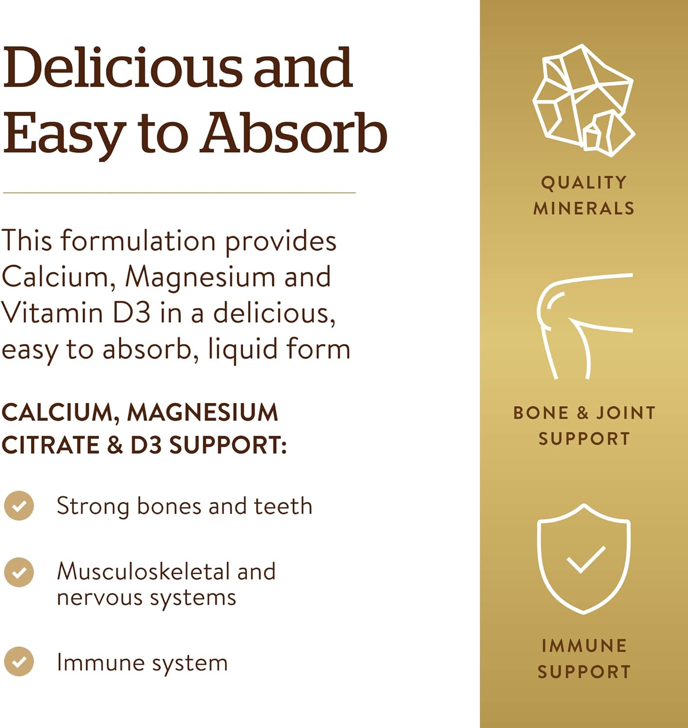 Three Vital Nutrients, One Great Flavor; Solgar Liquid Calcium Magnesium Citrate with Vitamin D3 provides Calcium, Magnesium, & Vitamin D3 in a delicious & easy to absorb liquid form for daily supplementation10A Powerful Pair; Calcium provides the building blocks that help keep bones & teeth strong & healthy; Magnesium helps to regulate calcium transport & stimulates the secretion of calcitonin, a hormone that aids in the influx of calcium into bone10Plus Vitamin D; Vitamin D is required to promote calcium absorption & supports a healthy immune system; Adequate Vitamin D & calcium as part of a healthful diet, along with physical activity, may reduce the risk of osteoporosis in later life10Gluten & Dairy Free, Kosher; Natural Blueberry flavored Solgar Liquid Calcium Magnesium Citrate with Vitamin D3 is free of: gluten, wheat, dairy, soy, yeast, sodium, artificial flavor, artificial sweetener, preservatives and color10The Gold Standard: For over 70 years, Solgar has been committed to quality, health, and well-being. Our mission is to create the finest nutritional supplements in small batches, through tireless research, using only the finest raw materials1010