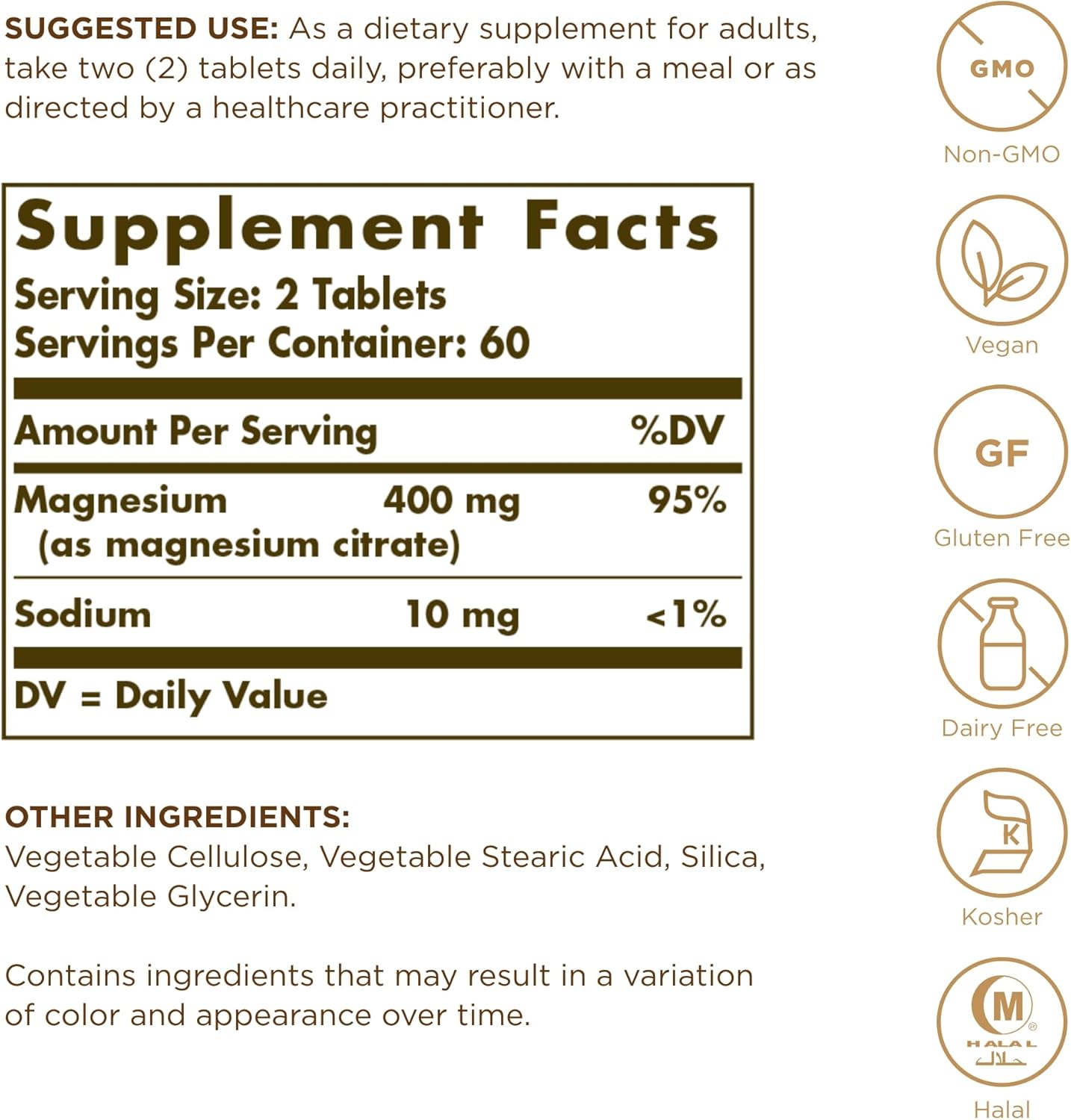 Non-Gmo, Gluten & Wheat Free; Solgar Magnesium Citrate Is Vegan, Kosher, And Free Of: Gluten, Wheat, Dairy, Soy, Yeast, Sugar, Sodium, Artificial Flavor, And Sweetener