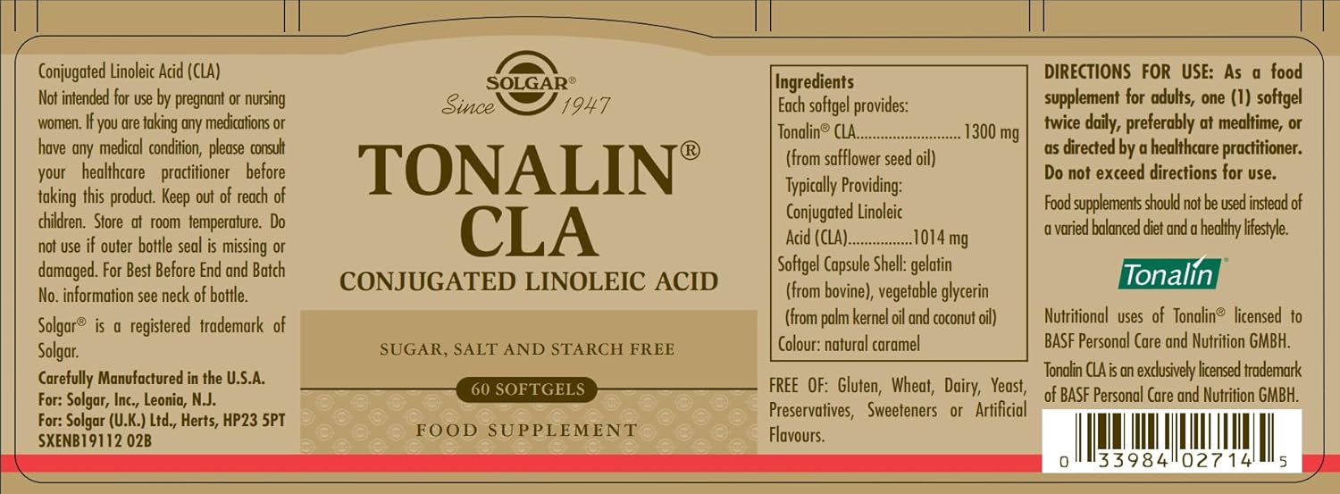 A SOURCE OF CLA - Solgar Tonalin CLA is derived from safflower seed oil, providing 1014 mg of Conjugated Linoleic Acid (CLA), taken as a softgel, twice daily. Fatty acids are lipids, the general term for dietary fat. The body can make several fatty acids, however, those it cannot make in adequate amounts must be obtained through the diet