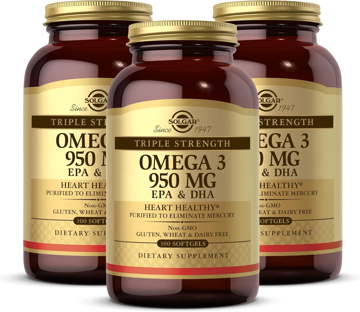 Solgar Triple Strength Omega 3 950 mg - 100 Softgels, Pack of 3 - Supports Cardiovascular, Joint & Skin Health - Non-GMO, Gluten Free, Dairy Free - 300 Total Servings