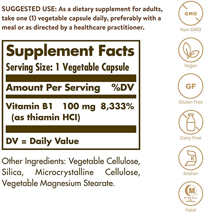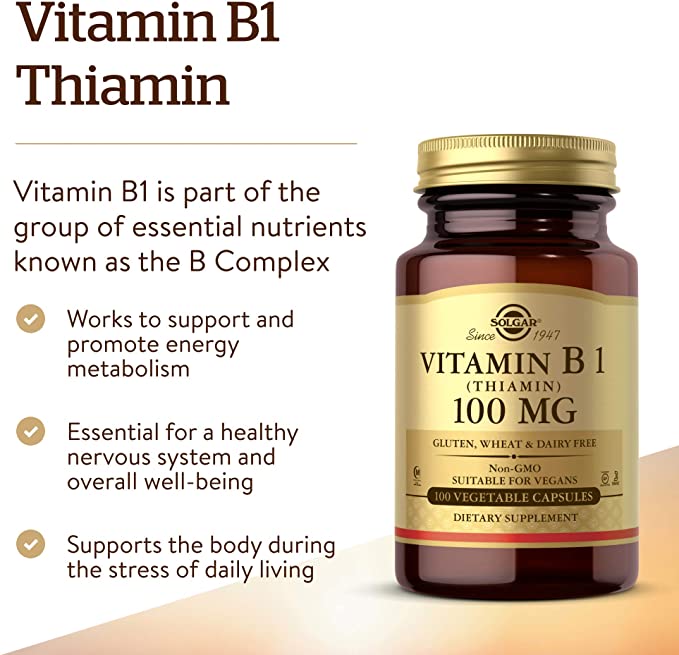 Solgar Vitamin B1 (Thiamin) 100 Mg, 100 Vegetable Capsules - Energy Metabolism, Healthy Nervous System, Overall Well-Being - Non-Gmo, Vegan, Gluten Free, Dairy Free - 100 Servings