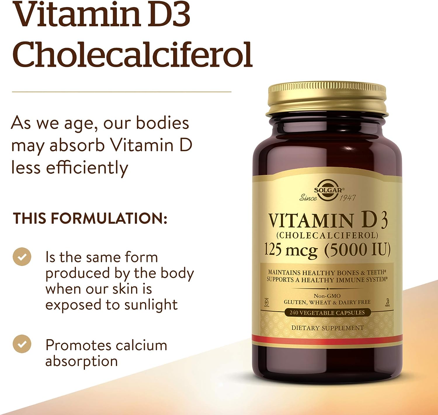 DESCRIPTION : Solgar Vitamin D3 (Cholecalciferol) 125 mcg (5000 IU), 240 Vegetable Capsules - Helps Maintain Healthy Bones & Teeth - Immune System Support - Non-GMO, Gluten Free, Dairy Free, Kosher - 240 Servings