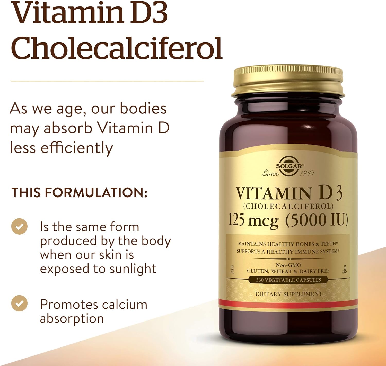 DESCRIPTION : Solgar Vitamin D3 Cholecalciferol 125 mcg 5000 IU Vegetable Capsules Helps Maintain Healthy Bones Teeth Immune System Support Non GMO Gluten Free Dairy Free Kosher Servings - 360 Count