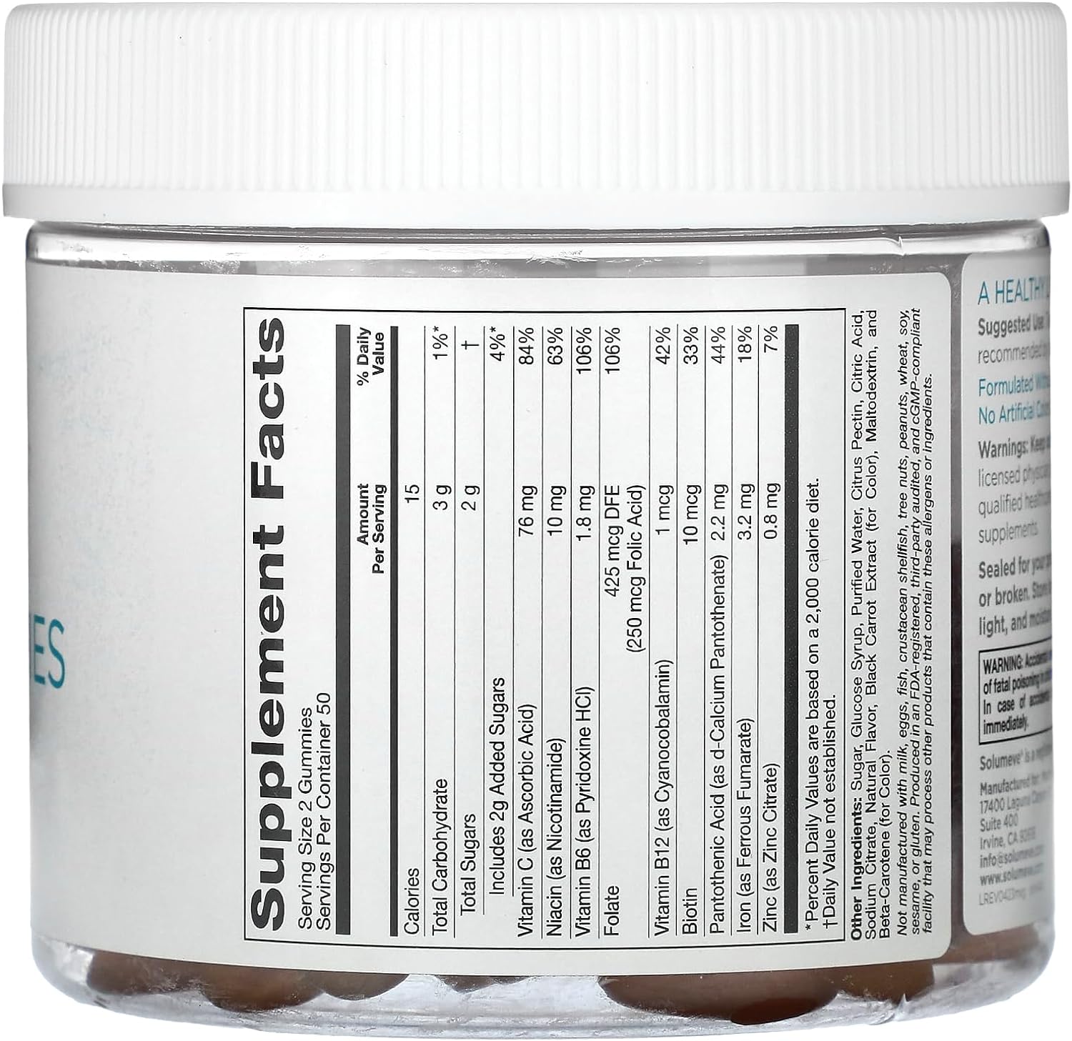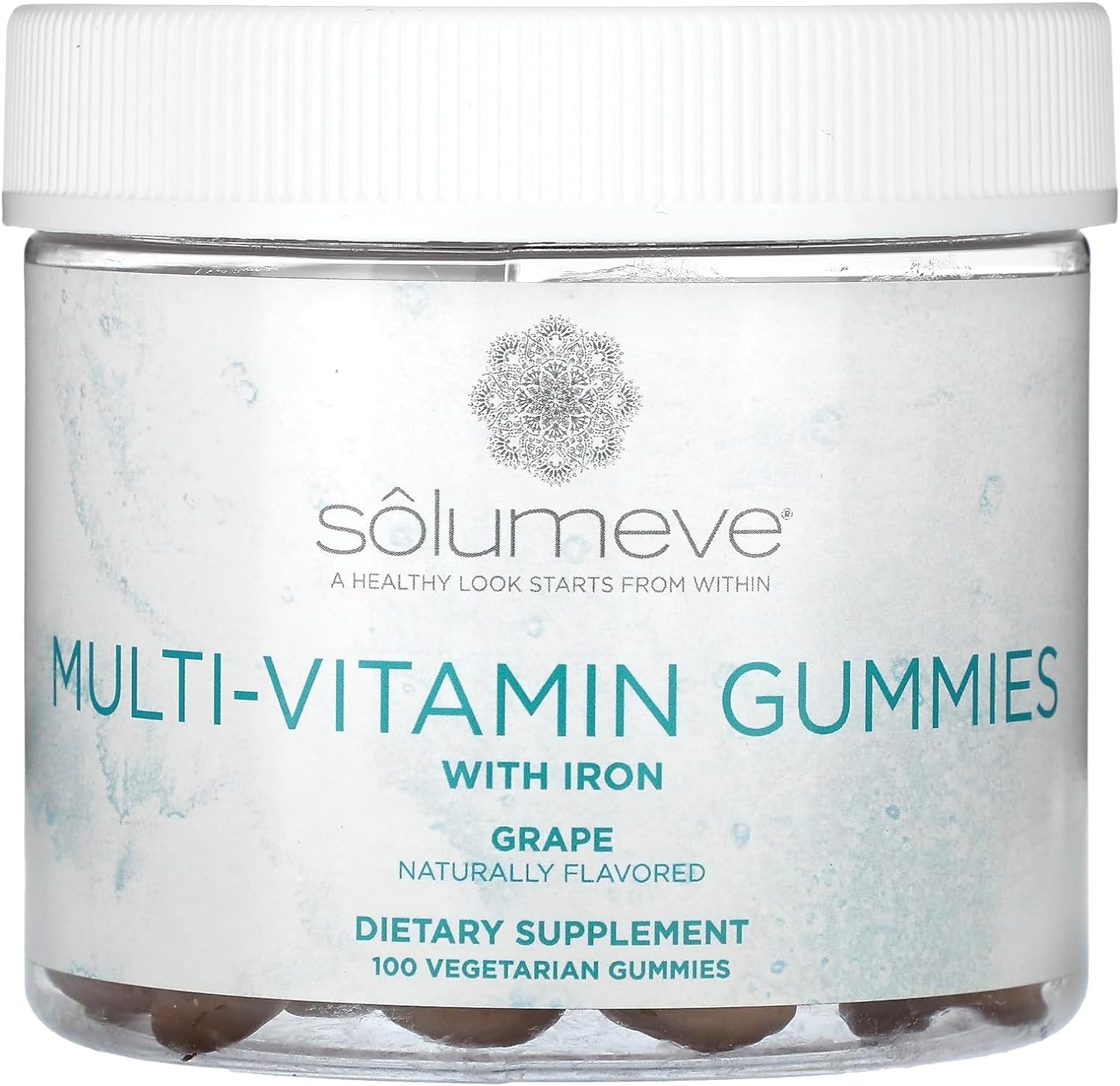 A well-balanced diet is often the best way to get your daily vitamins and minerals, but sometimes it can be a challenge. Taking a multivitamin can help fill in the occasional nutritional gaps, and these gummy vitamins can make it easy and tasty. Solumeve Multivitamin Gummies with Iron are a delicious addition to your daily routine and deliver a blend of important vitamins and minerals, including vitamins A, C, B6, and B12, as well as iron, zinc, and biotin. Made with citrus pectin, these multivitamin gummies contain no artificial sweeteners or colors, no gelatin, and no gluten. They are naturally grape flavored for a tasty, nutritious addition to your day. Suggested use Take 2 gummies daily, or as recommended by a healthcare practitioner. Main Ingredients Vitamin A (100% as Beta-Carotene), Vitamin C (as Ascorbic Acid), Niacin (as Nicotinamide), Vitamin B6 (as Pyridoxine HCl), Folate, Vitamin B12 (as Cyanocobalamin), Biotin, Pantothenic Acid (as Calcium D-Pantothenate), Iron (as Ferrous Fumarate), Zinc (as Zinc Oxide). Other Ingredients Sugar, Glucose Syrup, Water, Citrus Pectin, Citric Acid, Sodium, Citrate, Natural Flavor, Anthocyanins from Black Carrot and Black Carrot Extract (for Color), and Maltodextrin. Not manufactured with milk, eggs, fish, crustacean shellfish, tree nuts, peanuts, wheat, soy, sesame, or gluten. *These statements have not been evaluated by the FDA. This product is not intended to diagnose, treat, cure or prevent any disease