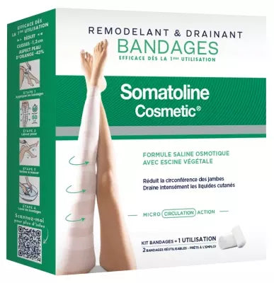 Somatoline Cosmetic Remodeling And Draining Kit 2 Bandages Is A Device Which Contributes To Reduce The Circumference Of The Legs And Drains Intensely The Cutaneous Liquids. At The Heart Of Its Effectiveness, A Formula Containing A Mixture Of Active Salts With An Intensive Osmotic Action: Integral Salt, Rich In Essential Trace Elements, And Magnesium Sulfate, Which, When Applied In Compresses, Drain Liquids Retained In The Tissues, Promote The Elimination Of Toxins And Stimulate The Reactivation Of Skin Micro-Circulation. Dermatologically Tested