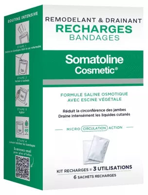 Somatoline Cosmetic Remodeling & Draining Refills Bandages 6 Refills Sachets Are Refills Sachets Of Somatoline Cosmetic Remodeling & Draining Bandages. This Kit Contains 6 Sachets (I.E. 3 Uses) Of The Formula. This Concentrate Of Active Ingredients With Remodeling And Draining Efficacy Is To Use To Soak The Bandages. At The Heart Of Its Effectiveness, A Formula Containing A Mix Of Active Salts With Intensive Osmotic Action: Integral Salt, Rich In Essential Trace