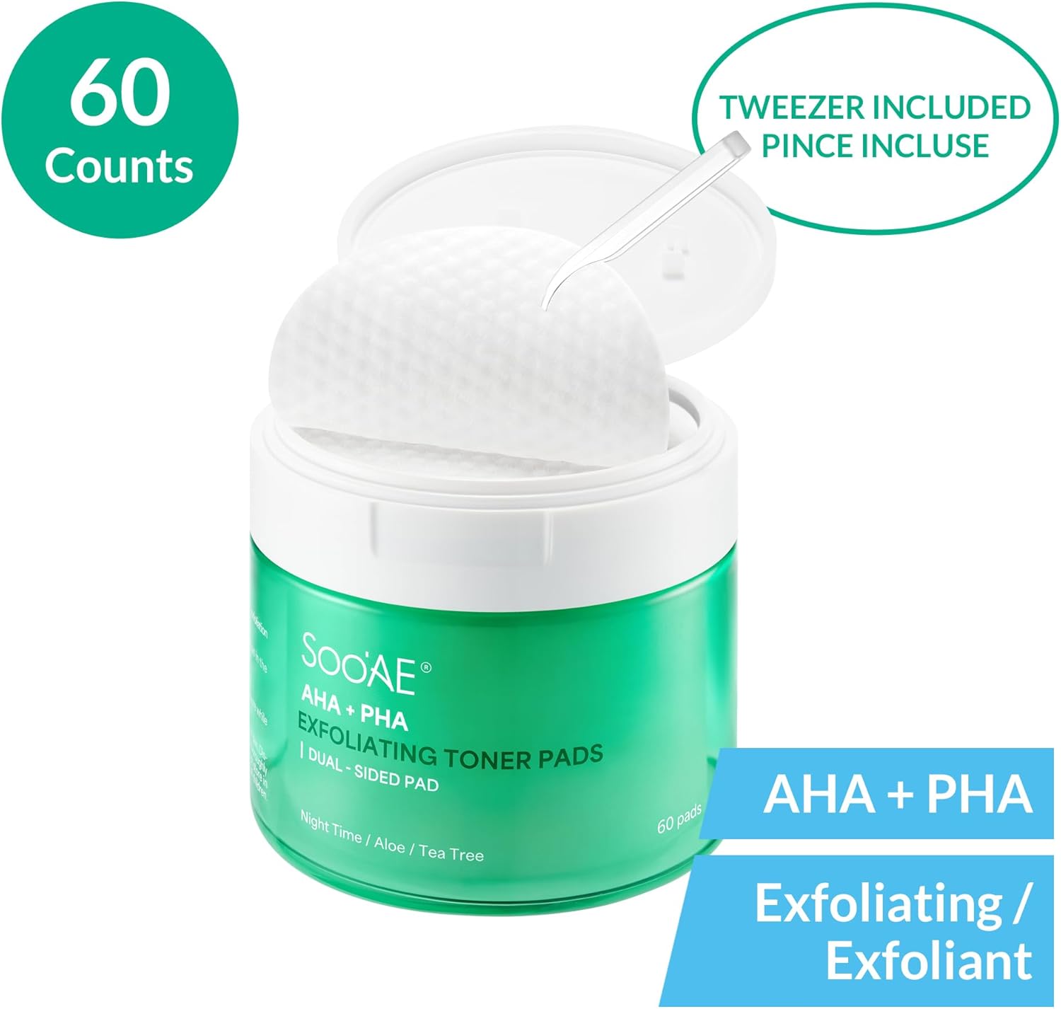 Soo'Ae Aha + Pha Exfoliating Toner Pads, 60 Dual-Sided Pads I Smooth Skin Texture Care For Porcelain-Like Skin, Cruelty-Free, Korean Skincare