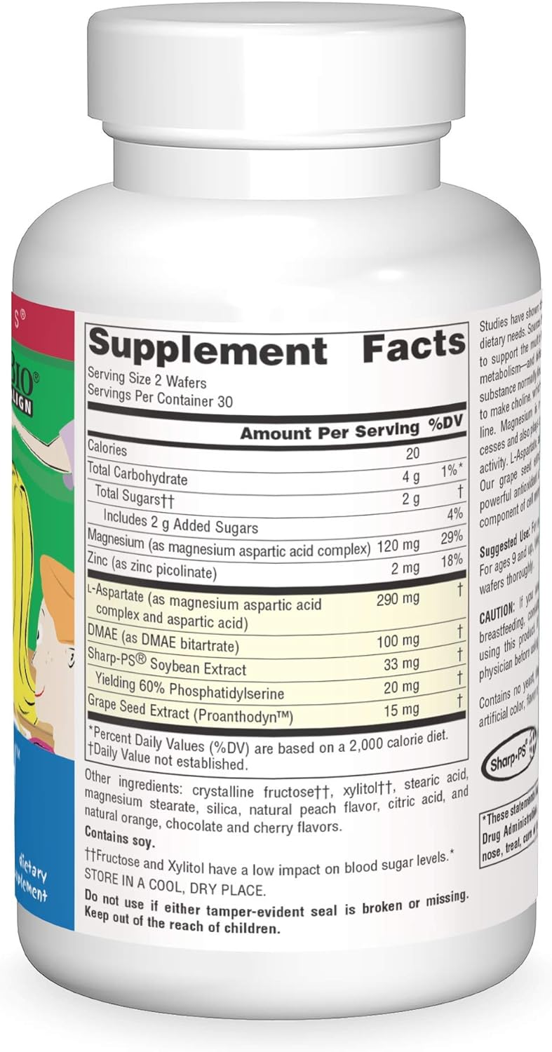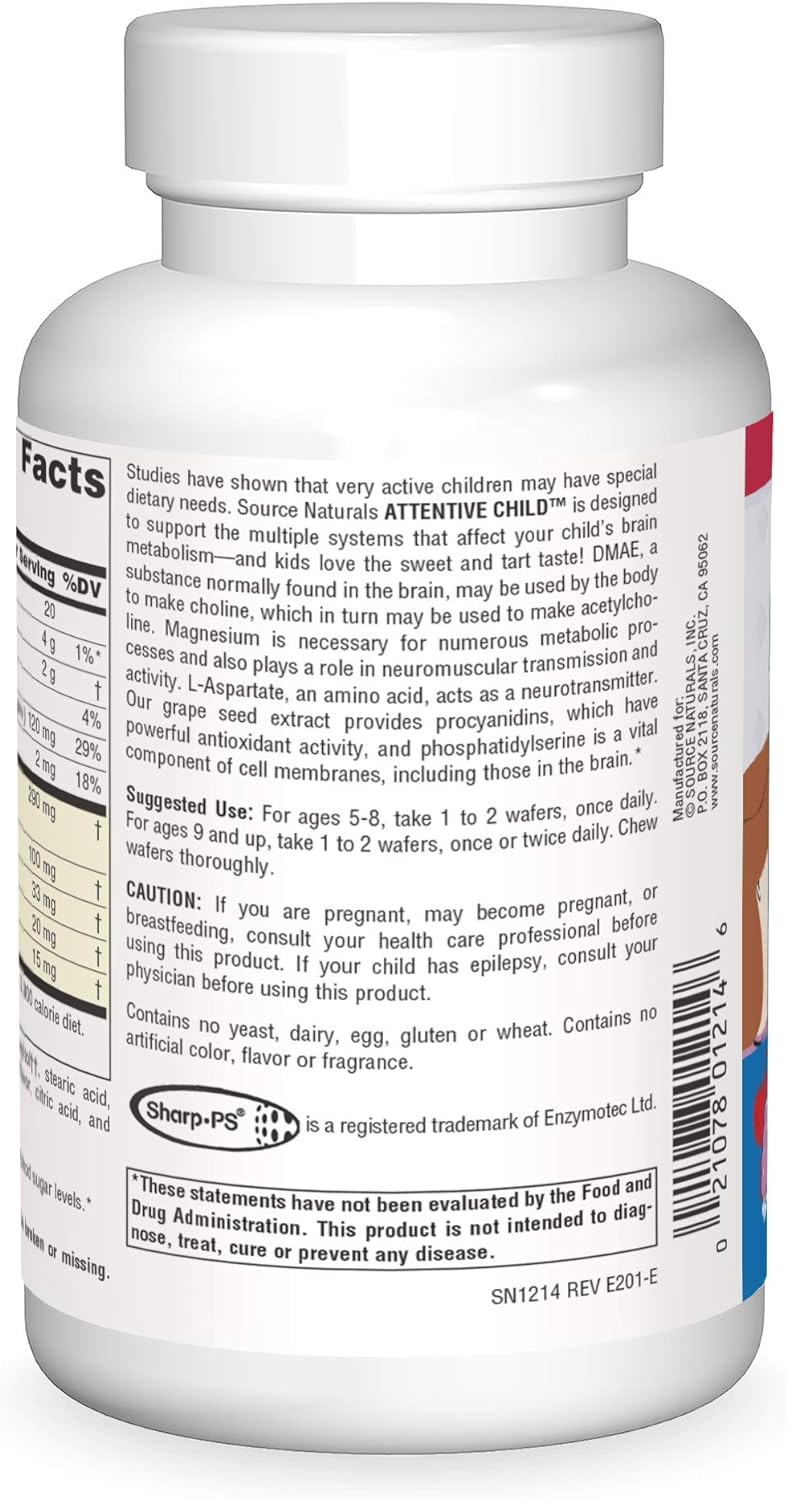DESCRIPTION : Source Naturals Attentive Child - Healthy Cognitive Nutrients For Active Children - Improved Focus & Attention with DMAE, Magnesium, Zinc & Grape Seed Extract - 60 Chewable Wafers