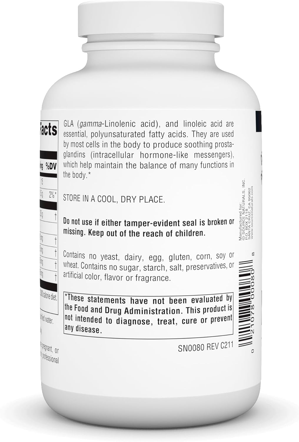Primrose Oil. Gamma-Linolenic Acid, Or Gla, And Linoleic Acid Are Essential, Polyunsaturated Fatty Acids. They Are Used By Most Cells In The Body To Produce Soothing Prostaglandins (Intracellular Hormone-Like Messengers), Which Help Maintain The Balance Of Many Functions In The Body10Suggested Use: 1 Softgel 1 To 4 Times Daily10Well Made Supplement: Contains No Yeast, Dairy, Egg, Gluten, Corn, Soy Or Wheat. Contains No Sugar, Starch, Salt, Preservatives, Or Artificial Color, Flavor Or Fragrance10Over 40 Years Of Trust. Source Naturals Was Created In 1982 By Ceo Ira Goldberg To Support Everyone’S Potential To Enjoy Optimal Health10Manufactured In The Usa. Manufactured In Scotts Valley, Ca, Under The Good Manufacturing Practices (Cgmps) Established By The Us Food And Drug Administration (Fda)10