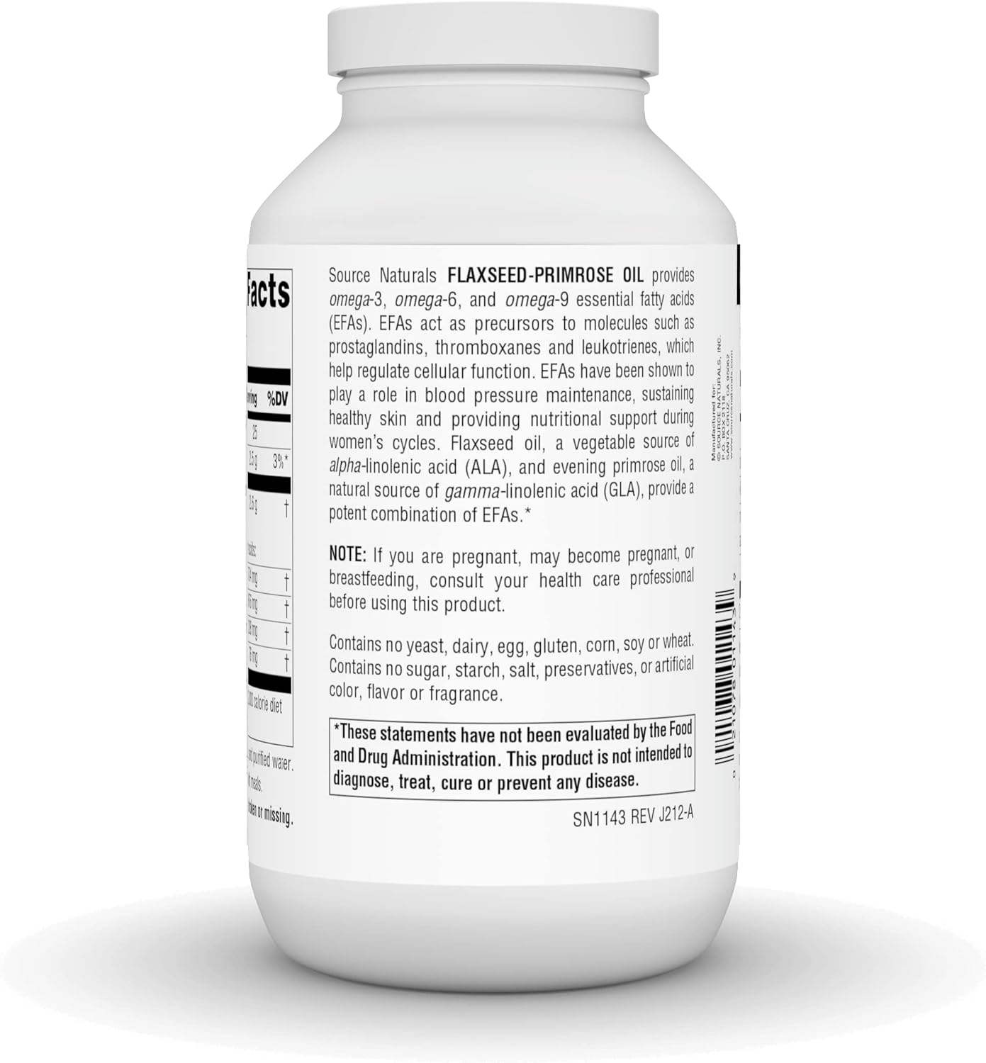 Dietary Supplement. Source Naturals Flaxseed-Primrose Oil Provides Both Omega-3 And Omega-6 Essential Fatty Acids (Efa'S). Efa'S Act As Precursors To Molecules Such As Prostaglandins, Thromboxanes And Leukotrienes, Which Help Regulate Cellular Function. Efa'S Have Been Shown To Play A Role In Blood Pressure Maintenance, Sustaining Healthy Skin And Providing Nutritional Support During Women'S Cycles. Flaxseed Oil, A Rich Vegetable Source Of Alpha-Linolenic Acid (Ala) And Evening Primrose Oil, A Natural Source Of Gamma-Linolenic Acid (Gla), Provide A Potent Combination Of Efa'S. (These Statements Have Not Been Evaluated By The Food And Drug Administration. This Product Is Not Intended To Diagnose, Treat, Cure Or Prevent Any Disease.)