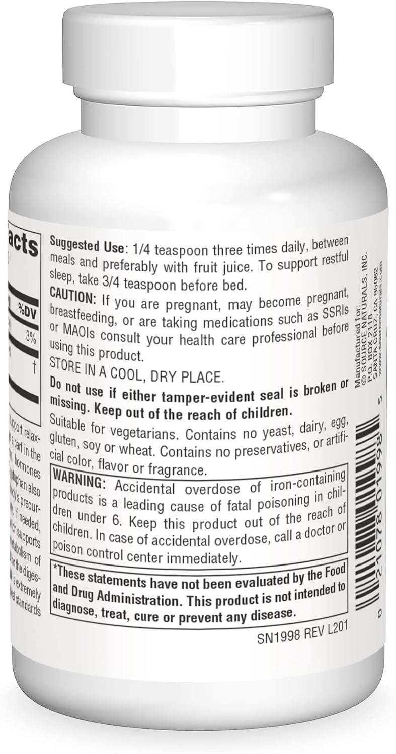 Suggested Use: 1/4 teaspoon three times daily, between meals and preferably with fruit juice. To support restful sleep, take 3/4 teaspoon before bed