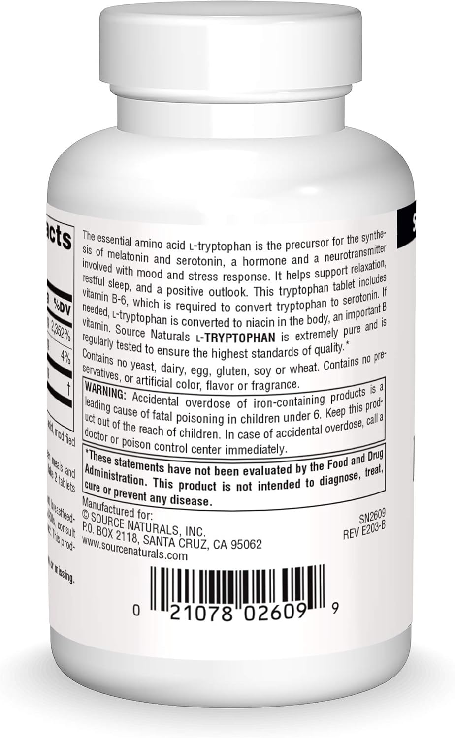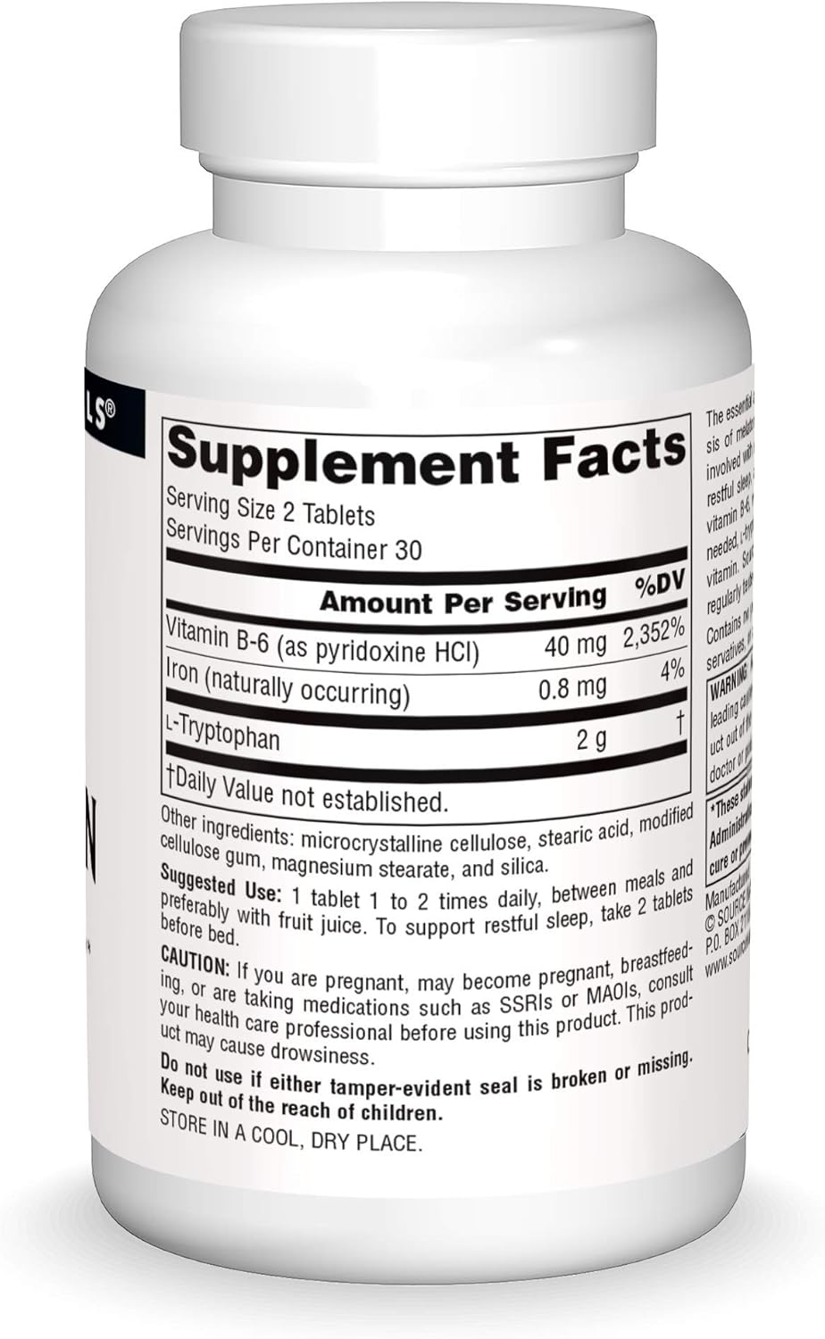 Source Naturals L-Tryptophan With Vitamin B-6 1000 Mg Support Mood, Relaxation And Sleep - 60 Tablets