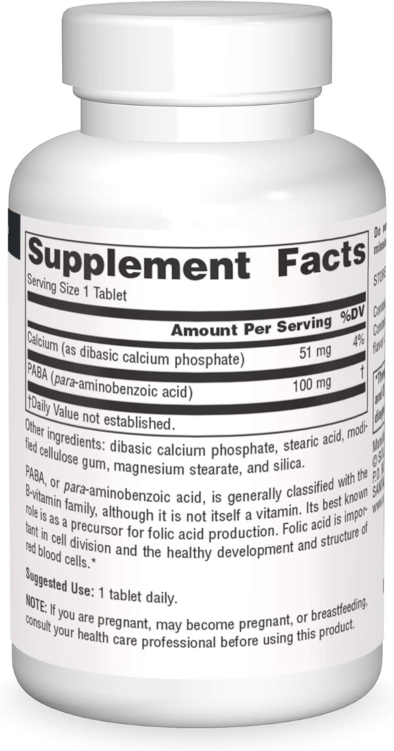 Source Naturals Paba - Para-Amino Benzoic Acid, 100 Mg Dietary Supplement - 100 Tablets