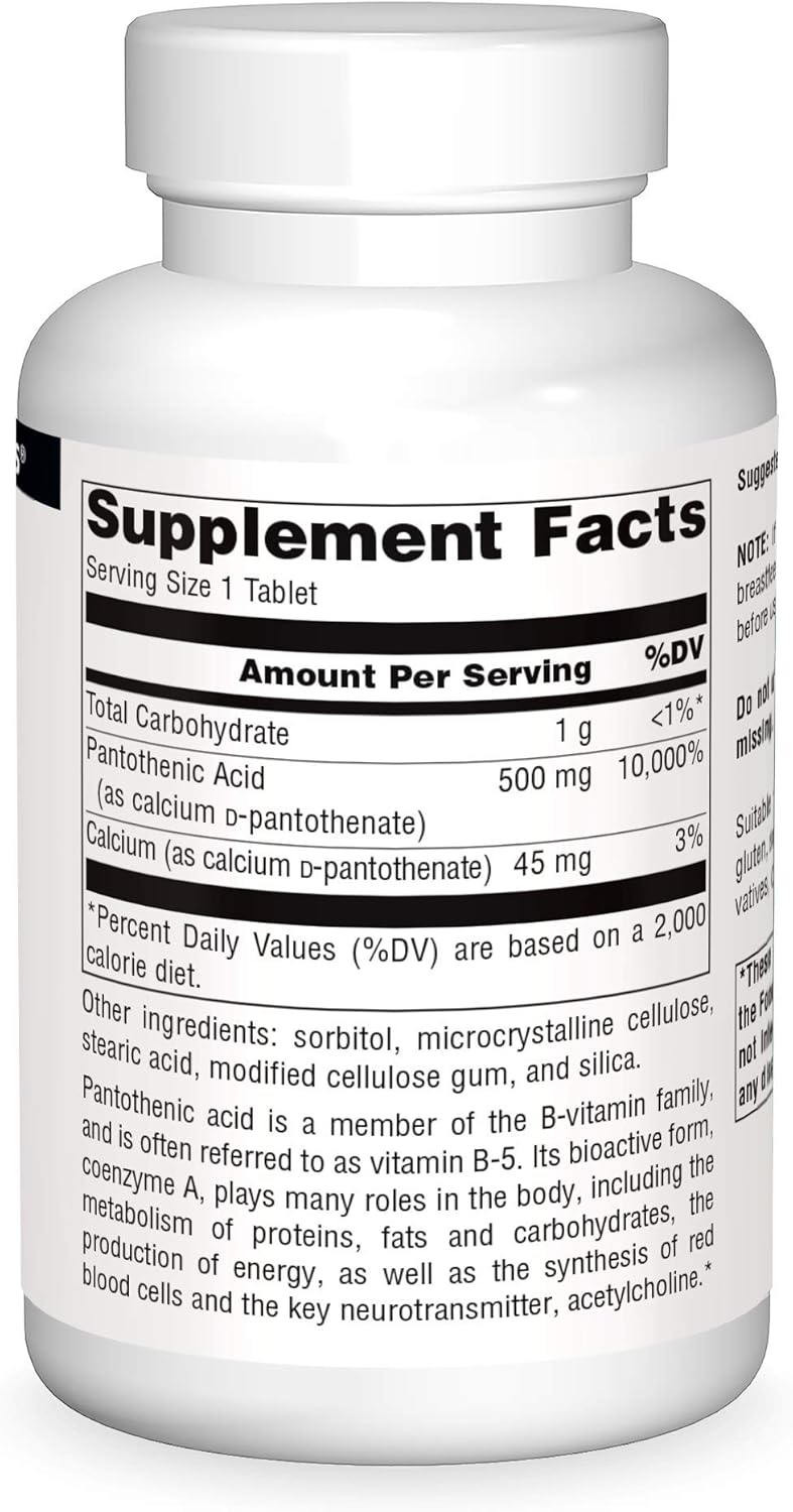 Source Naturals Pantothenic Acid Is A Member Of The B-Vitamin Family, And Is Often Referred To As Vitamin B-5. Its Bioactive Form, Coenzyme A, Plays Many Roles In The Body, Including The Metabolism Of Proteins, Fats And Carbohydrates, The Production Of Energy, And The Synthesis Of Red Blood Cells And The Key Neurotransmitter, Acetylcholine. The Suggested Use Is To Take 1 Tablet Daily. Please Contact Our In-House Customer Support If You Have Any Questions