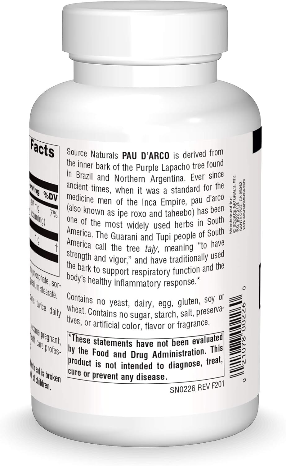 Source Naturals Pau D’Arco Is The Highest Quality Inner Bark Of The Purple Lapacho Tree Found In Brazil And Northern Argentina. Ever Since Ancient Times, When It Was A Standard For The Medicine Men Of The Inca Empire, Pau D’Arco (Also Known As Ipe Roxo And Taheebo) Has Been One Of The Most Widely Used Herbs In South America. Its Popularity Is Attributed To The Active Constituent, Lapachol, Which Has Been The Subject Of Numerous Scientific Studies. The Suggested Use Is To Take 1 To 2 Tablets Twice Daily In Between Meals. Please Contact Our In-House Customer Support If You Have Any Questions