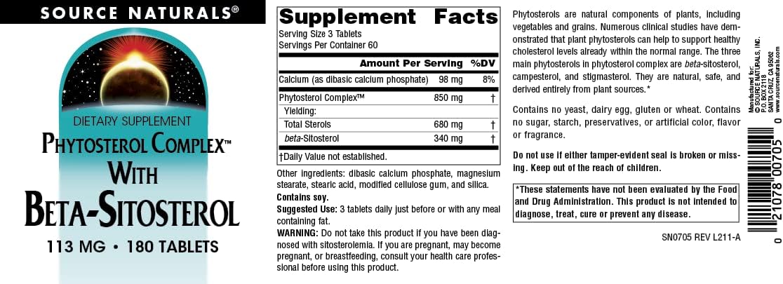 Source Naturals Phytosterol Complex With Beta-Sitosterol, Supports Healthy Cholesterol Levels*, 113 Mg - 180 Tablets