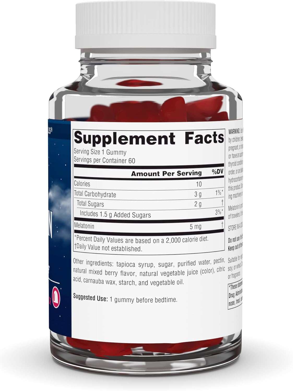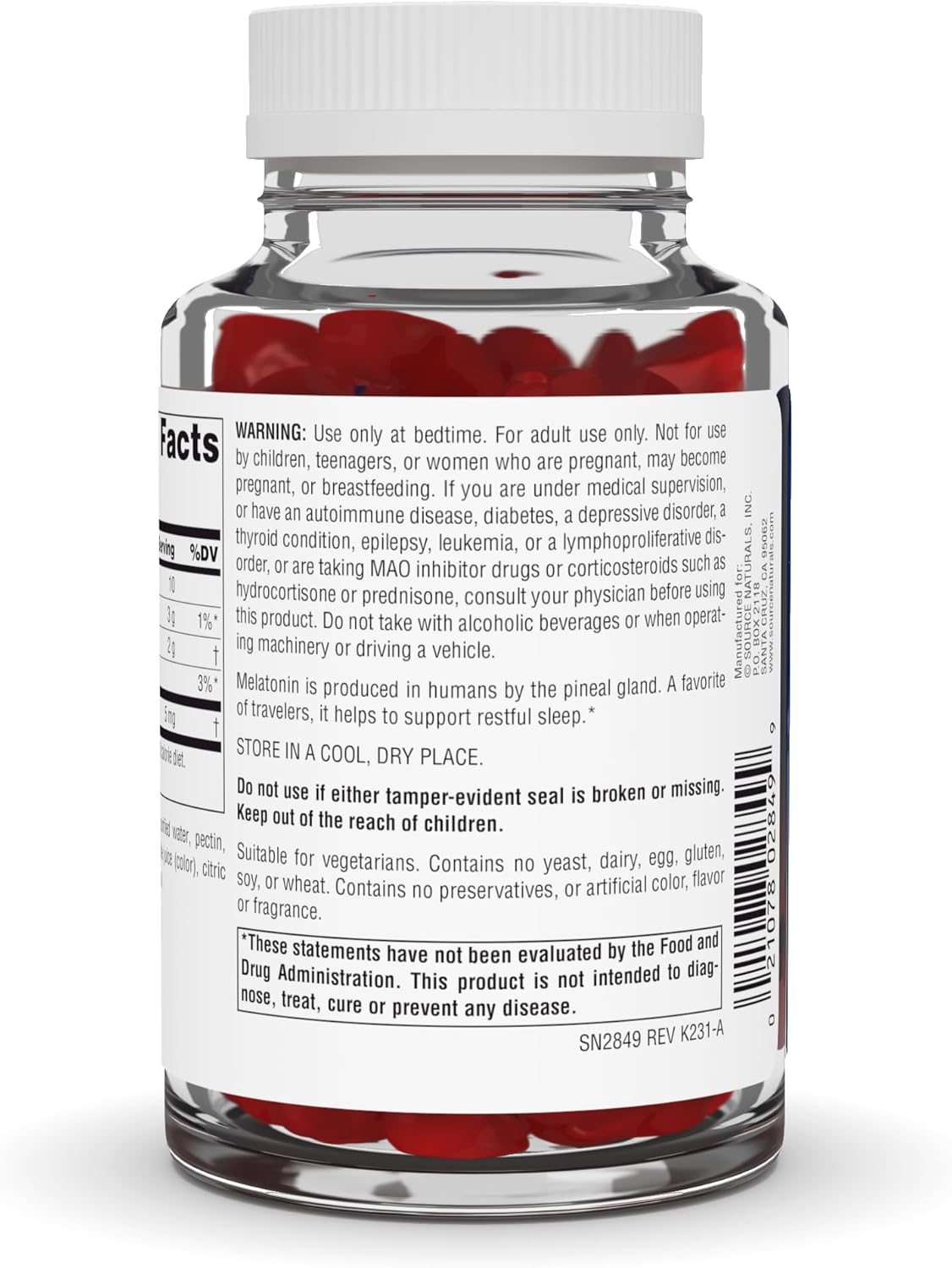 A Favorite Among Travelers! This Version Of Melatonin Contains 5 Mg, And Has A Great Fruit Flavored Taste10Suggested Use. 1 Gummy Before Bedtime10Suitable For Vegetarians. Contains No Yeast, Dairy, Egg, Gluten, Soy, Or Wheat. Contains No Preservatives, Or Artificial Color, Flavor Or Fragrance10Over 40 Years Of Trust. Source Naturals Was Created In 1982 By Ceo Ira Goldberg To Support Each Individual'S Potential To Enjoy Optimal Health10Manufactured In The Usa. Manufactured In Scotts Valley, Ca, Under The Good Manufacturing Practices (Cgmps) Established By The Us Food And Drug Administration (Fda)10
