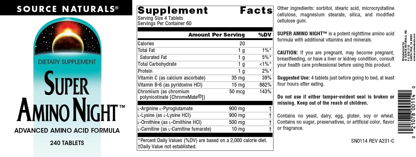 Source Naturals Super Amino Night Is A Potent Nighttime Amino Acid Formula With Additional Vitamins And Minerals. The Suggested Use Is 4 Tablets Just Before Going To Bed, At Least Four Hours After Eating. Please Contact Our In-House Customer Support If You Have Any Questions