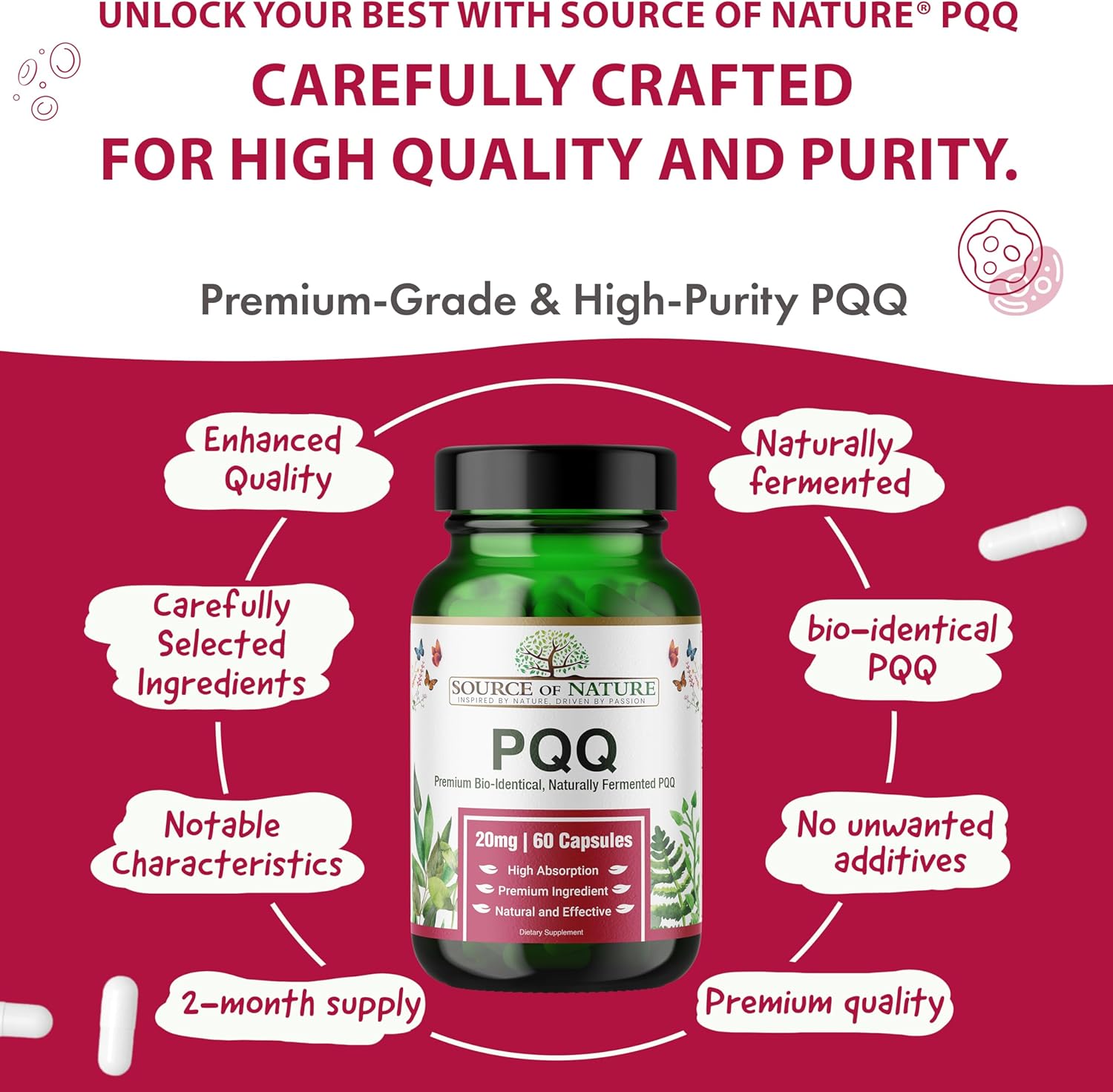 About this item ? 60 Capsules, 20mg PQQ per Serving – This bottle provides a convenient 2-month supply with each serving of one capsule, offering excellent value and flexibility for your daily routine. ?? Premium Bio-Identical Fermented PQQ – Formulated using high-quality PQQ produced through natural fermentation, yielding a bio-identical form to that found in nature, ensuring optimal purity and quality. ?? 100% Natural Product – PQQ is a naturally occurring compound found in foods like kiwi, green peppers, and fermented soybeans. Our supplement offers a simple way to incorporate this unique compound into your diet. ?? High Potency Formula – With 20mg per capsule, our PQQ supplement delivers a substantial dose to support your nutritional intake. ?? No Unwanted Additives – Our formula is free from unnecessary additives, preservatives, and common allergens, providing you with a clean and straightforward supplement. ?? Gentle & Easy-to-Swallow Capsules – Designed for effortless consumption, our capsules make it simple to include PQQ in your daily wellness regimen. ?? Third-Party Tested for Purity – Each batch undergoes rigorous testing for quality and potency, ensuring you receive a safe and reliable product. ?? Premium Danish Supplements – At Source of Nature, we provide natural, additive-free supplements designed to enhance your well-being. With over 85,000 satisfied customers worldwide, we are committed to quality, transparency, and customer satisfaction. › See more product details,? 60 Capsules, 20mg PQQ per Serving – This bottle provides a convenient 2-month supply with each serving of one capsule, offering excellent value and flexibility for your daily routine,?? Premium Bio-Identical Fermented PQQ – Formulated using high-quality PQQ produced through natural fermentation, yielding a bio-identical form to that found in nature, ensuring optimal purity and quality,?? 100% Natural Product – PQQ is a naturally occurring compound found in foods like kiwi, green peppers, and fermented soybeans. Our supplement offers a simple way to incorporate this unique compound into your diet,?? High Potency Formula – With 20mg per capsule, our PQQ supplement delivers a substantial dose to support your nutritional intake,?? No Unwanted Additives – Our formula is free from unnecessary additives, preservatives, and common allergens, providing you with a clean and straightforward supplement,?? Gentle & Easy-to-Swallow Capsules – Designed for effortless consumption, our capsules make it simple to include PQQ in your daily wellness regimen,?? Third-Party Tested for Purity – Each batch undergoes rigorous testing for quality and potency, ensuring you receive a safe and reliable product,?? Premium Danish Supplements – At Source of Nature, we provide natural, additive-free supplements designed to enhance your well-being. With over 85,000 satisfied customers worldwide, we are committed to quality, transparency, and customer satisfaction