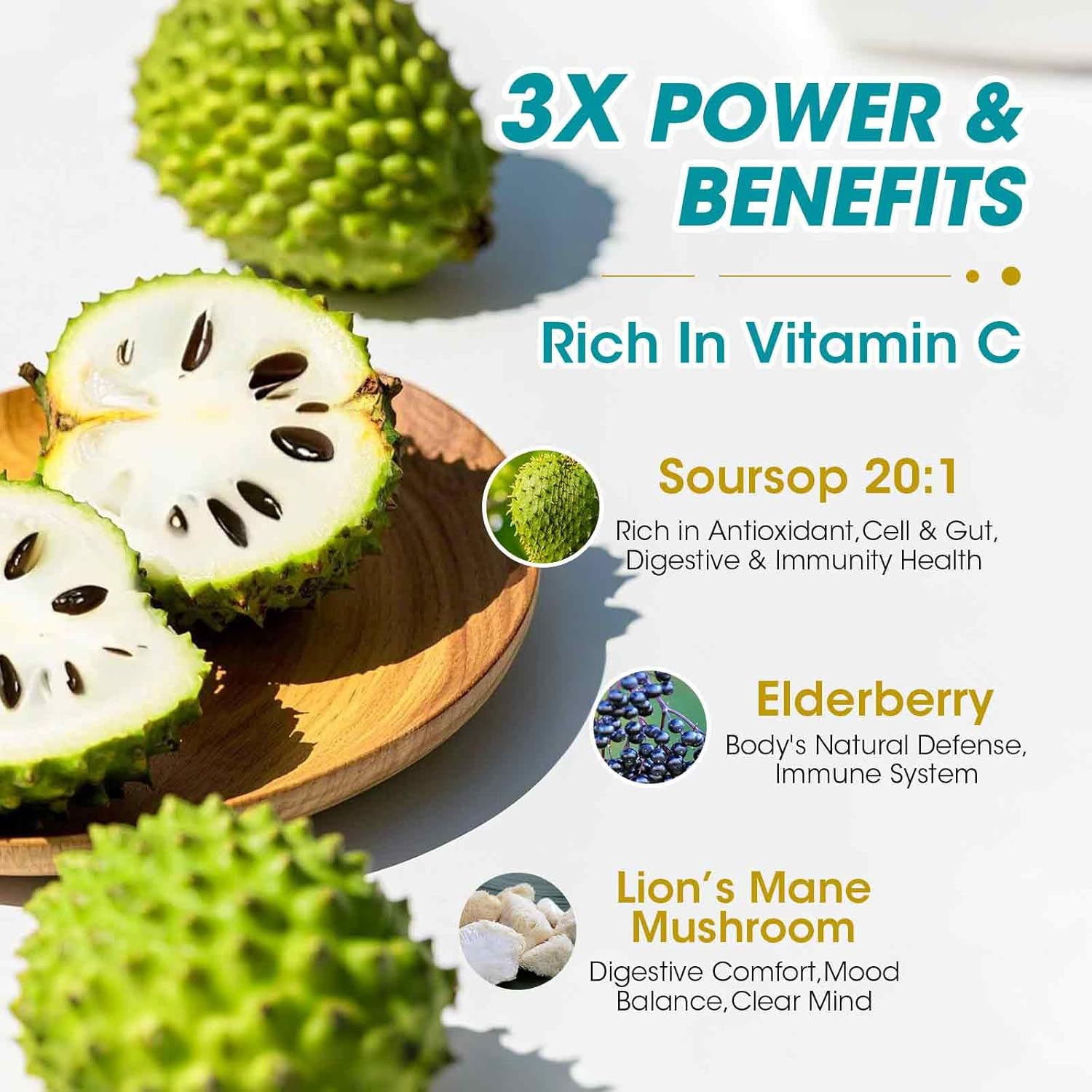 With Elderberry & Lion’s Mane Mushroom3-in-1 synergy fromula beyond single soursop formula. Lion’s Mane supports gut-brain communication, and Elderberry’s plant-based flavonoids enhance Graviola’s benefits