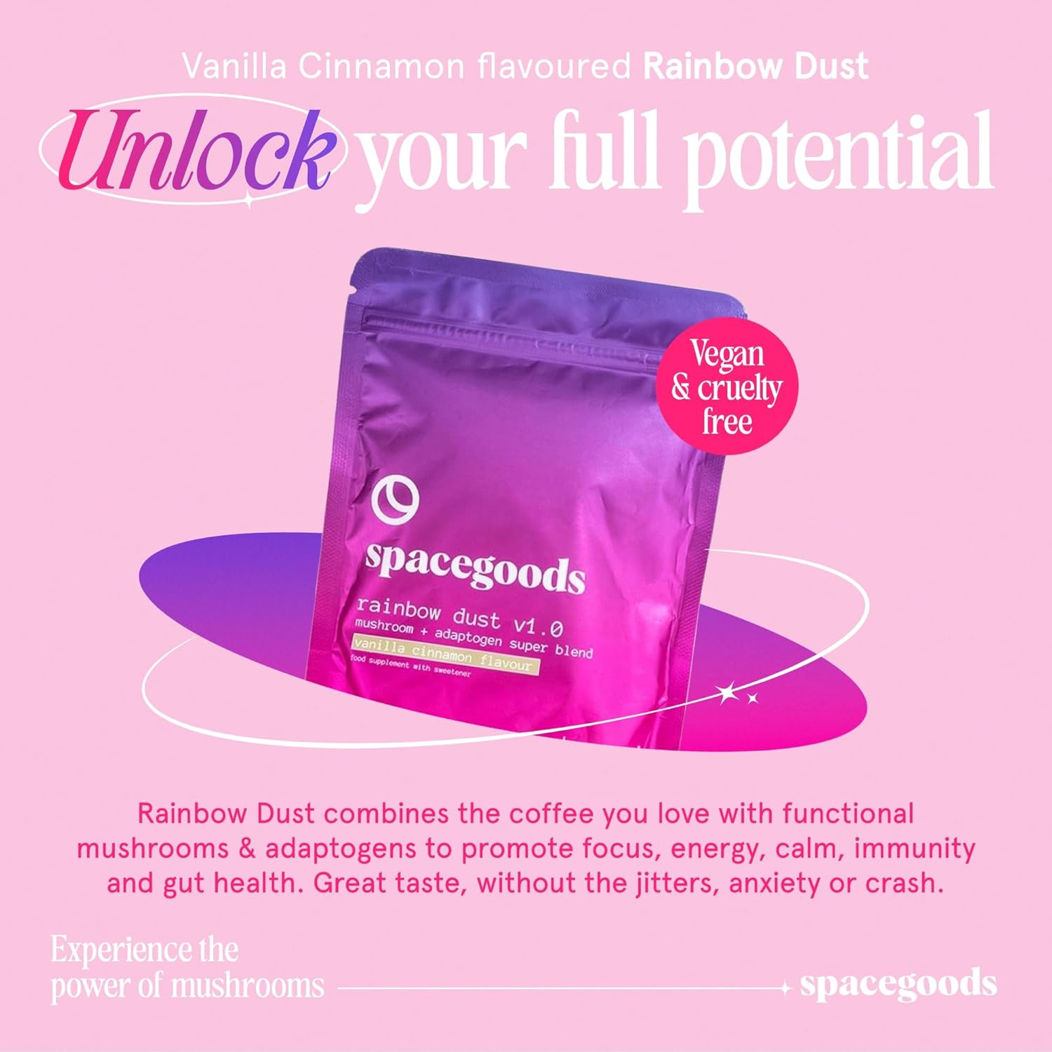 Spacegoods Rainbow Dust 6 Pack 240G | 180 Days Supply | Flavoured Mushroom Coffee | 80Mg Of Natural Caffeine | Lions Mane, Chaga, Ashwagandha & Vitamin B5 | Focus, Energy & Calm | Vanilla & Cinnamon