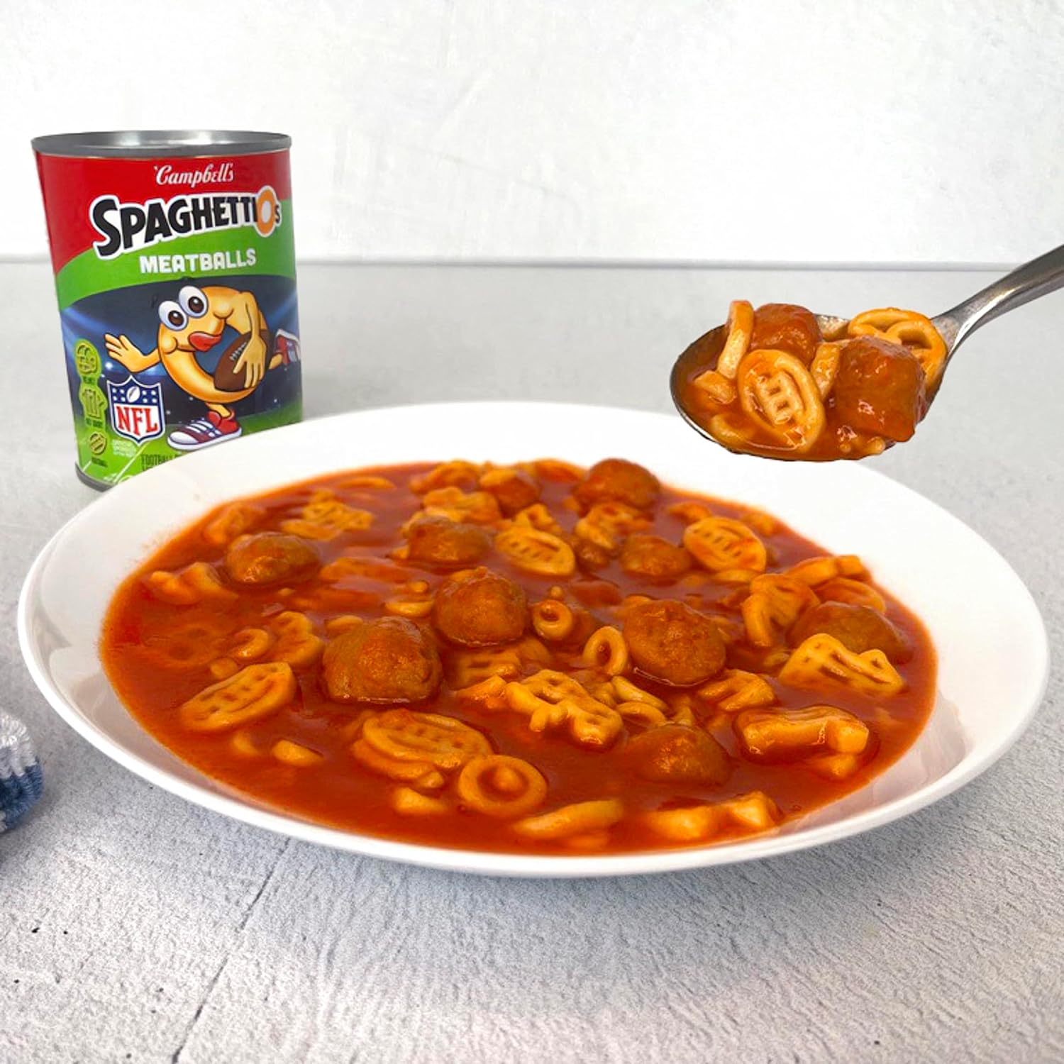 One (1) 15.6 oz can of SpaghettiOs Football Shaped Canned Pasta with Meatballs10Neat o-shaped pasta and football shaped pasta that adds character to every bite10Canned SpaghettiOs features delicious tomato sauce and meatballs made with chicken and beef for a lunchtime the whole family will love10Serve 1 cup of SpaghettiOs as a healthy kids entree, pack some as part of a kids lunch or enjoy as part of a nostalgic adult lunch or dinner10Pasta and tomato sauce features 1/2 cup of vegetables and 11 grams of protein per 1 cup serving10Dig into a dish the whole family will enjoy with SpaghettiOs Football Shaped Canned Pasta with Meatballs. Each delicious bite of this canned pasta and meatballs features the classic o-shaped pasta you know and love, plus football pasta shapes to add some fun to lunchtime. This canned pasta puts a yummy spin on original SpaghettiOs with the addition of savory meatballs, making it a delicious part of any meal. One cup of football shaped SpaghettiOs with meatballs contains 1/2 cup of vegetables and 11 grams of protein as part of a lunch. Break out this convenient canned food when you're craving lunch, or prepare it as an entree for a fun kids lunch. This microwave pasta is ready in as little as 3 minutes. Just heat in a microwave-safe bowl on high for 1 1/2 to 2 minutes, let stand for 1 minute, then stir. Or, cook up this fun-loving pasta on the stove. The can is recyclable for easy disposal. Add character to every bite with SpaghettiOs: the neat round spaghetti you can eat with a spoon. In addition to football pasta with meatballs, SpaghettiOs offers a variety of unique pasta in fun shapes and varieties, including SpaghettiOs Original, and more!