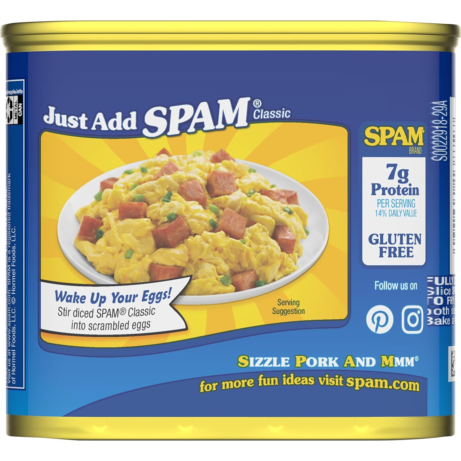 Shelf stable; does not require refrigeration until after it's opened1025% less sodium10Fully cooked canned pork with ham10Item Package Dimensions: 13.0" L x 9.625" W x 3.375" H1010Having to cut back on sodium can take a lot of tasty things out of the equation. Fortunately, SPAM less sodium is not one of those things. It provides the same delicious SPAM Classic flavor with 25% less sodium. There's no sacrifice with this meat treat