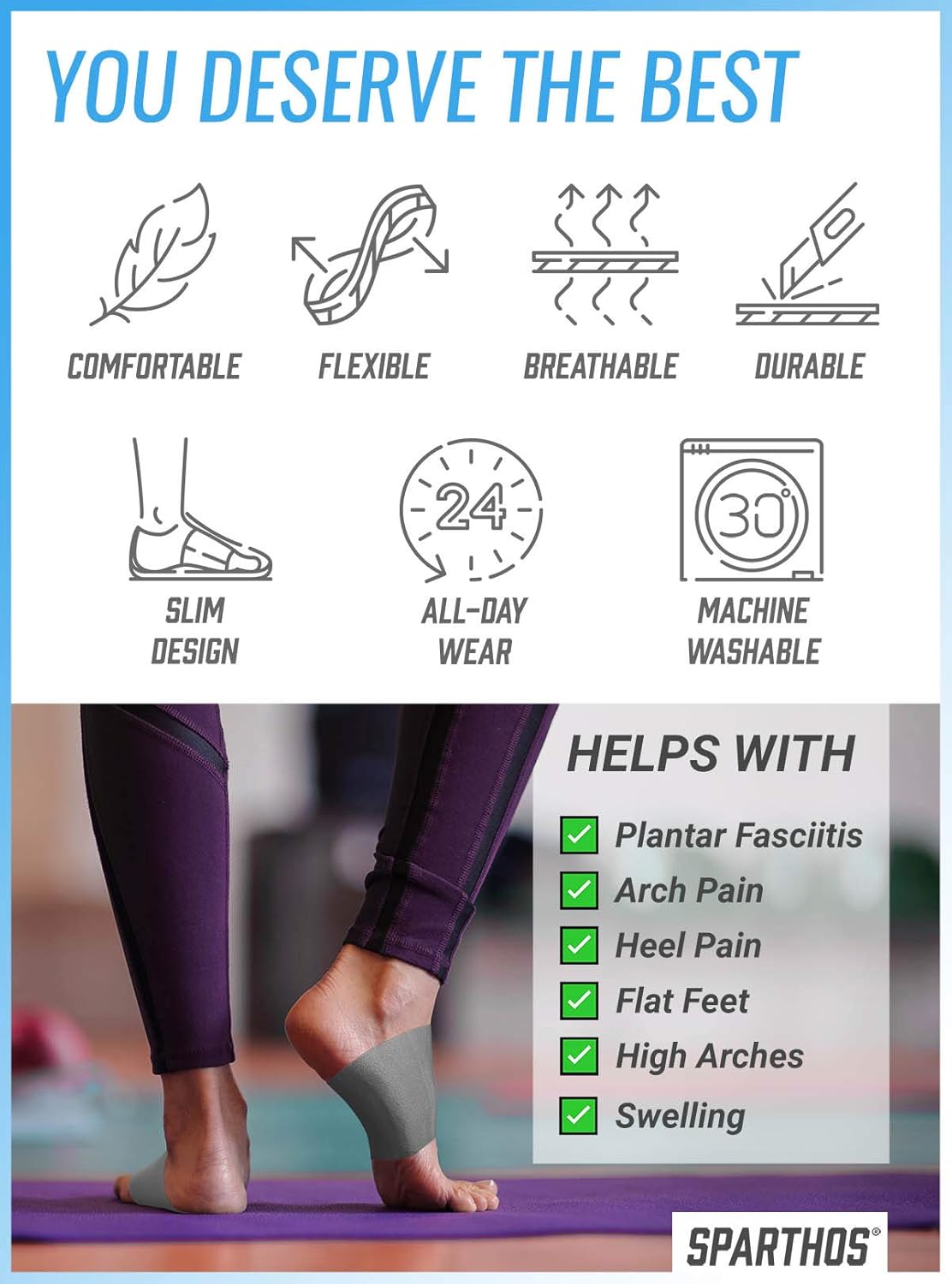 About this item END THE PAIN - Plantar Fasciitis, arch and heel pain, flat feet and other conditions can be so painful they make it almost impossible for you to walk. Sparthos ankle arch support compression sleeves apply just the right pressure to support your feet and relieve the pain. Helps you to heal faster! BE COMFORTABLE AND CONFIDENT AGAIN - Sparthos arch supports are engineered for all-day wearing - at work, relaxing or at the gym. Slip them on and experience how comfortable and easy to wear these elastic support inserts truly are. Fit feet of any shape! FORGET ABOUT SWELLING - Choose the size that best matches you and immediately improve foot circulation and reduce the swelling in your feet. Wear it all day and night for pain relief and accelerated healing. YOU DESERVE THE BEST! - made from highly durable double-stitched elastic material that stretches to fit without overstretching. Fabric is breathable to reduce discomfort and sweat absorbent. Slim design can be worn with virtually any type of shoe or even barefoot. WE LOVE OUR CUSTOMERS, ORDER NOW! - Sparthos USA Based Customer Happiness Team is here to help with any questions or issues. Didn't love these Arch Sleeves Just contact us for a full refund. See more product details, END THE PAIN - Plantar Fasciitis, arch and heel pain, flat feet and other conditions can be so painful they make it almost impossible for you to walk. Sparthos ankle arch support compression sleeves apply just the right pressure to support your feet and relieve the pain. Helps you to heal faster!, BE COMFORTABLE AND CONFIDENT AGAIN - Sparthos arch supports are engineered for all-day wearing - at work, relaxing or at the gym. Slip them on and experience how comfortable and easy to wear these elastic support inserts truly are. Fit feet of any shape!, FORGET ABOUT SWELLING - Choose the size that best matches you and immediately improve foot circulation and reduce the swelling in your feet. Wear it all day and night for pain relief and accelerated healing, YOU DESERVE THE BEST! - made from highly durable double-stitched elastic material that stretches to fit without overstretching. Fabric is breathable to reduce discomfort and sweat absorbent. Slim design can be worn with virtually any type of shoe or even barefoot, WE LOVE OUR CUSTOMERS, ORDER NOW! - Sparthos USA Based Customer Happiness Team is here to help with any questions or issues. Didn't love these Arch Sleeves Just contact us for a full refund