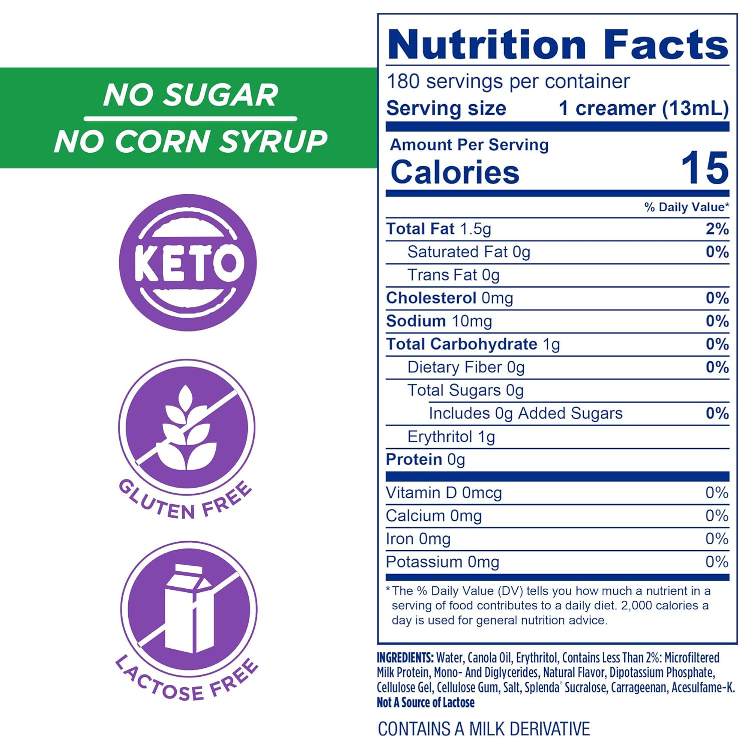 Sugar Free: Your Health Is Important To Us! We Have Removed The Sugar And Corn Syrup While Keeping The Taste You Expect With A Traditional Liquid Coffee Creamer. This Delicious Creamer Is Also Gluten Free And Lactose Free With 0G Trans Fat