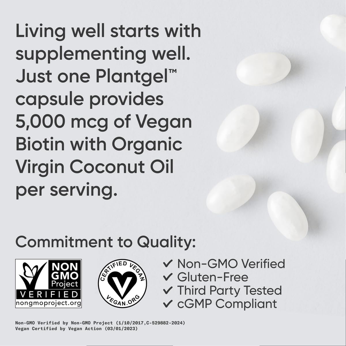Sports Research Extra Strength Vegan Biotin (Vitamin B) Supplement With Organic Coconut Oil - Supports Keratin For Healthier Hair & Skin - Great For Women & Men - 5,000Mcg, 30 Veggie Softgel Capsules
