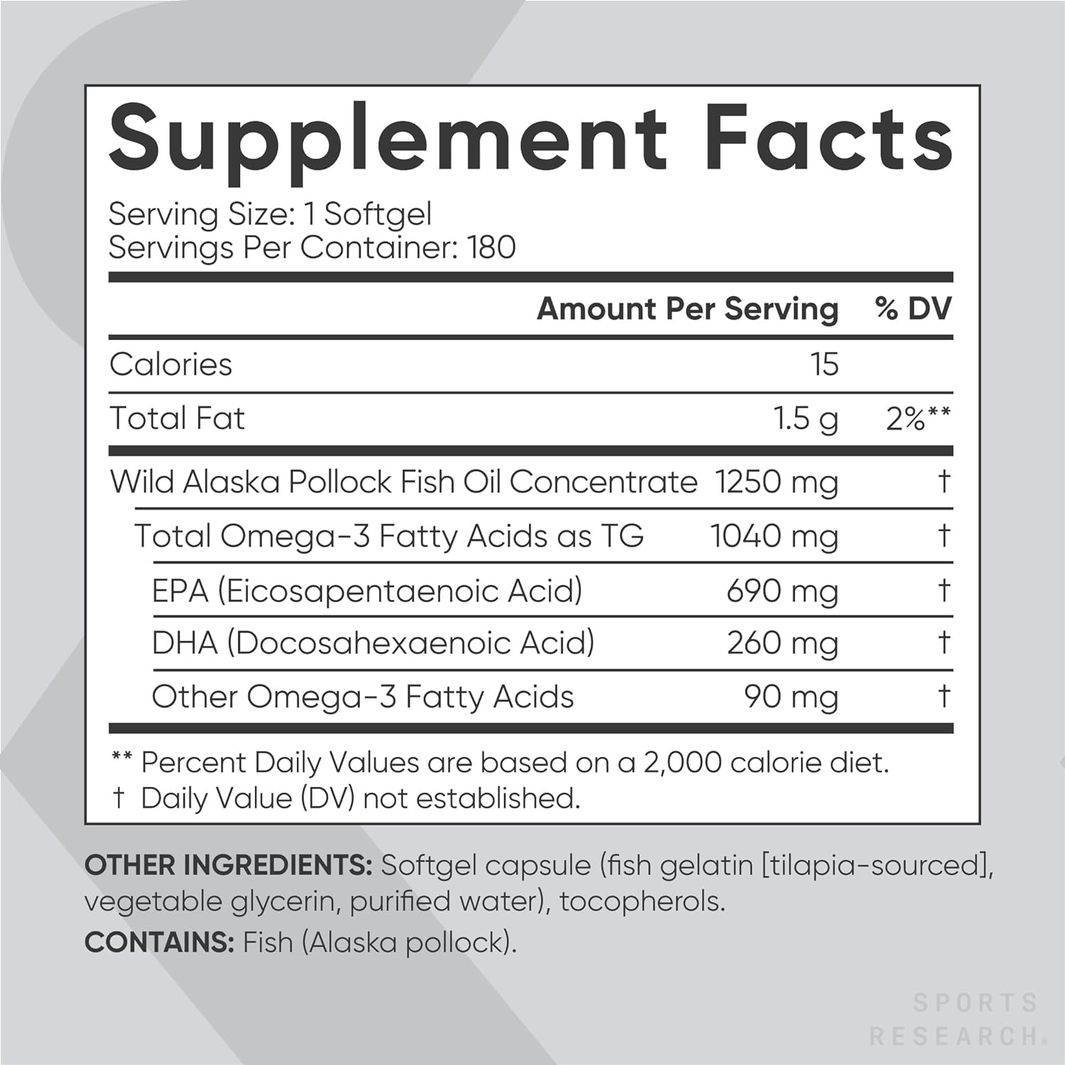 DESCRIPTION : Sports Research Triple Strength Omega 3 Fish Oil from Wild Alaska Pollock - Burpless Fish Oil Supplement with Triglyceride EPA & DHA Fatty Acids - Heart, Brain & Immune Support – 1250mg, 180 Softgels180 Count (Pack of 1)