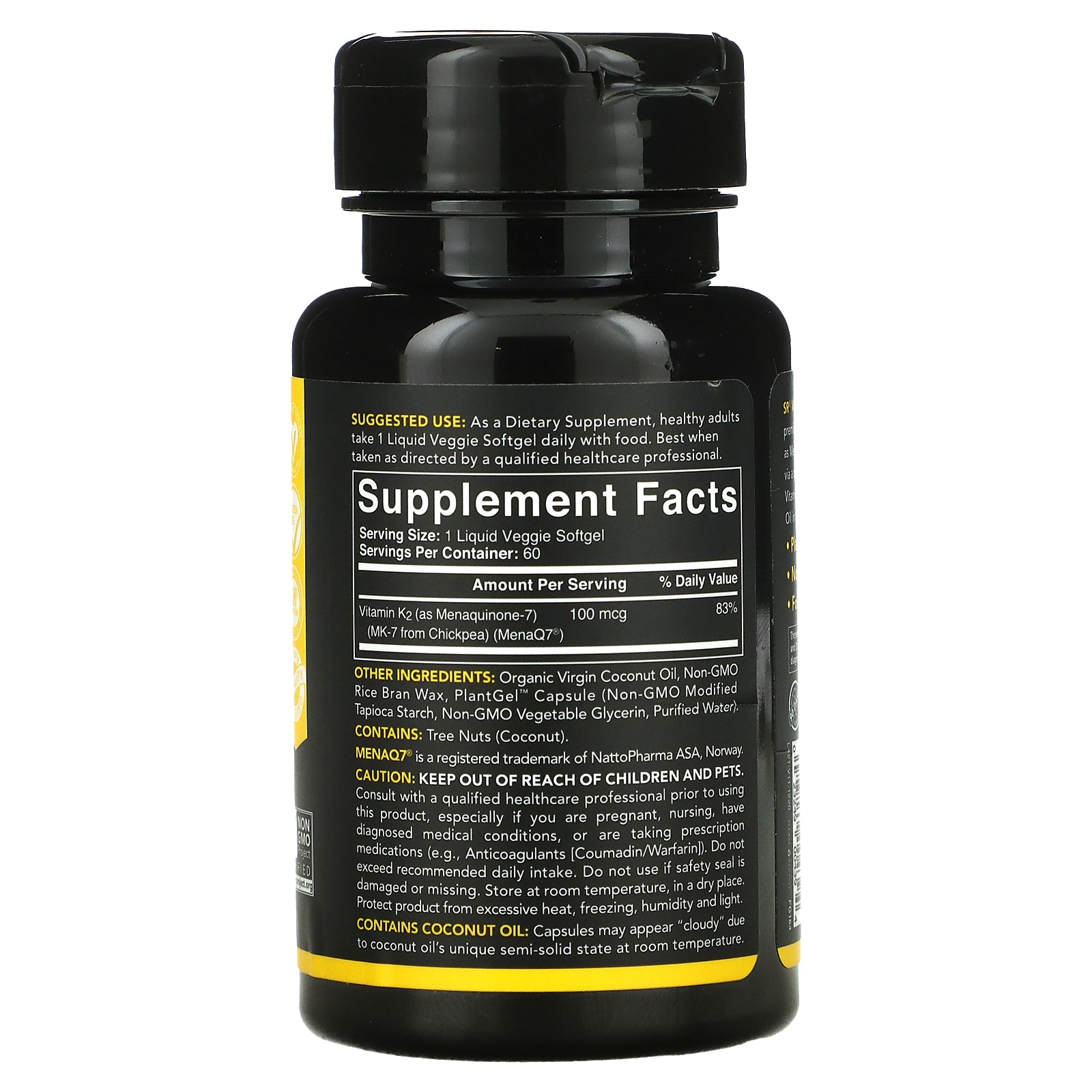 SR® Vitamin K2 featuring MenaQ7 is a premium, Non-GMO form of Vitamin K2 (MK-7 as Menaquinone-7). Derived from chickpeas via a proprietary fermentation process, SR® Vitamin K2 is combined with Virgin Coconut Oil in a Vegan Certified PlantGel™ Capsule.