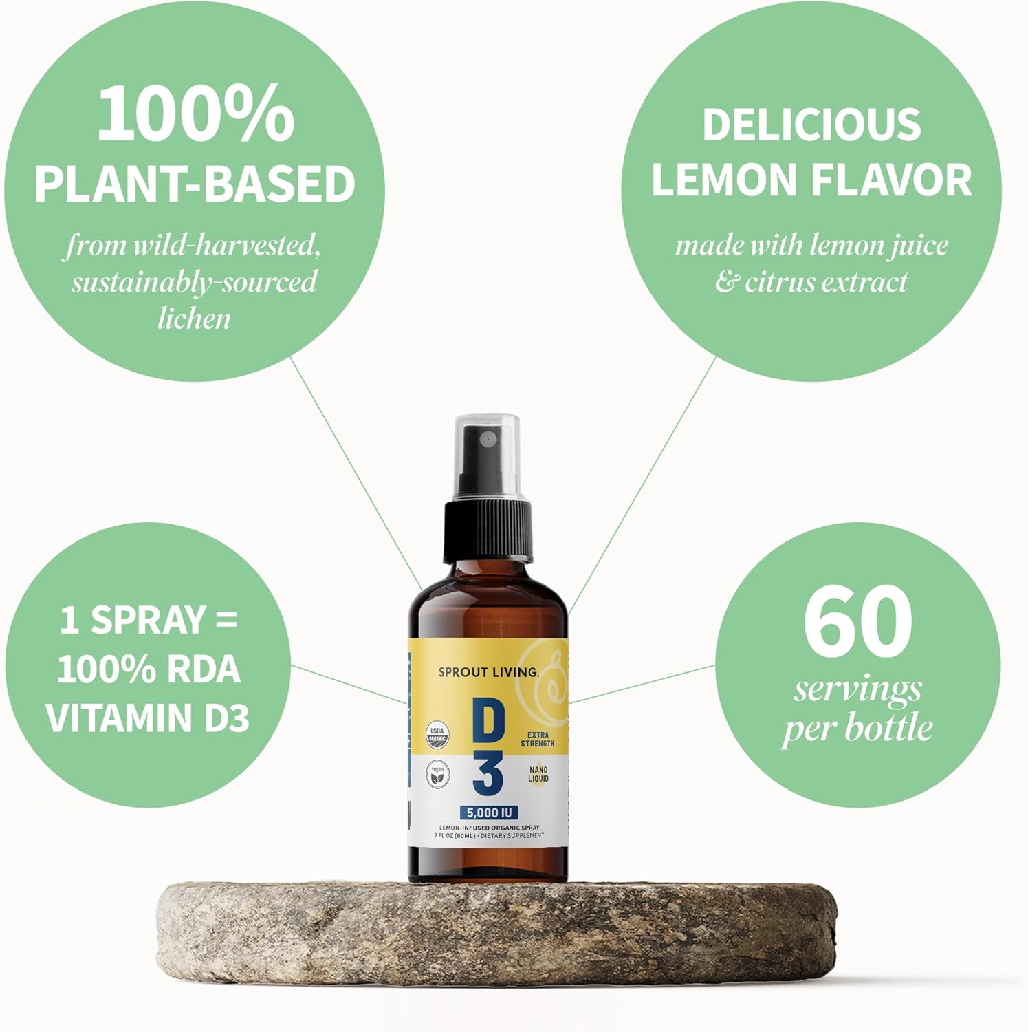 Sprout Living Organic Vitamin D3 5000 Iu (Lichen) Spray For Immune Support & Bone Health | Trace Minerals With Real Lemon & Citrus Extract, Sugar Free (2 Fl Oz, 60 Servings)