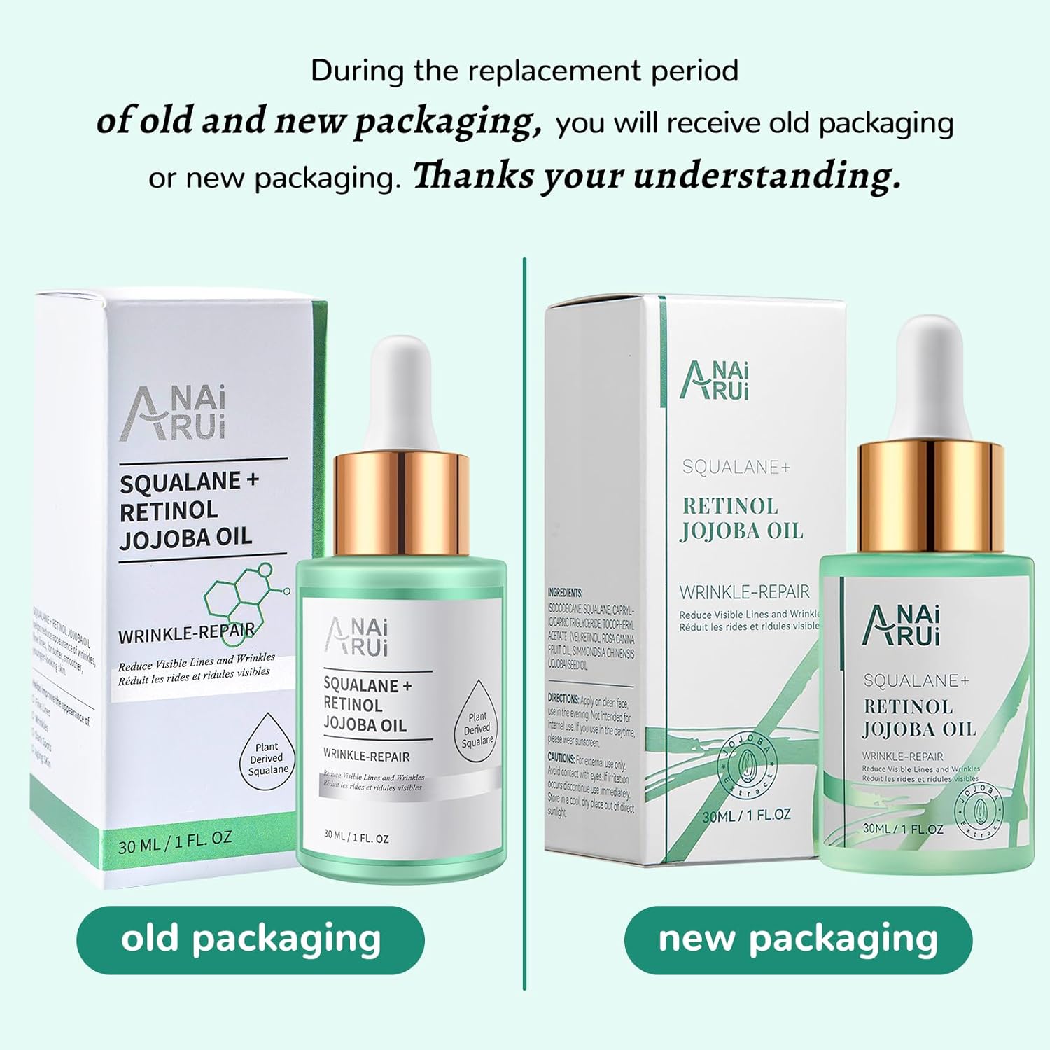 About this item Squalane Retinol Jojoba facial oil moisturizer is a lightweight and non-greasy face oil that can easily penetrate the skin and delivers long-lasting hydration, moisture and prevent water loss, helps boost collagen production, and improve the appearance of wrinkles, fine lines, for softer, smoother, younger looking skin. Dryness and Collagen reduction are the main factors that cause our skin elasticity loss. Squalane oil is a great moisturizer that can effectively moisturize dry skin, and increase skin elasticity and firmness, while retinol reduces fine lines and wrinkles by increasing the production of collagen, Jojoba oil help slow the aging signs of fine lines & wrinkles. Derived from sugarcane and Olive, Squalane is a lightweight, nongreasy facial oil moisturizer that rapidly penetrates the skin to instantly hydrate and lock in moisture, making Squalane an ideal anti-aging skincare ingredient to replenish skin’s natural moisture. Also great for moisturizing hair, cuticles, dry hands and feet, and lips. Our squalane + retinol jojoba oil can be applied on hair, neck, and body, and help make-up set, or use as cleanser oil. Safe for all skin types, increases skin radiance by improving texture and suppleness. It protects skin from moisture loss and leaves behind a soft, natural scent. Lightweight oil, Non-irritating, and suitable for all skin types, including dry, sensitive, oily, and acne-prone. If you have any questions about our product, please contact us directly and we will try our best to provide you with assistance! See more product details,Squalane Retinol Jojoba facial oil moisturizer is a lightweight and non-greasy face oil that can easily penetrate the skin and delivers long-lasting hydration, moisture and prevent water loss, helps boost collagen production, and improve the appearance of wrinkles, fine lines, for softer, smoother, younger looking skin,Dryness and Collagen reduction are the main factors that cause our skin elasticity loss. Squalane oil is a great moisturizer that can effectively moisturize dry skin, and increase skin elasticity and firmness, while retinol reduces fine lines and wrinkles by increasing the production of collagen, Jojoba oil help slow the aging signs of fine lines & wrinkles,Derived from sugarcane and Olive, Squalane is a lightweight, nongreasy facial oil moisturizer that rapidly penetrates the skin to instantly hydrate and lock in moisture, making Squalane an ideal anti-aging skincare ingredient to replenish skin’s natural moisture. Also great for moisturizing hair, cuticles, dry hands and feet, and lips,Our squalane + retinol jojoba oil can be applied on hair, neck, and body, and help make-up set, or use as cleanser oil. Safe for all skin types, increases skin radiance by improving texture and suppleness. It protects skin from moisture loss and leaves behind a soft, natural scent,Lightweight oil, Non-irritating, and suitable for all skin types, including dry, sensitive, oily, and acne-prone. If you have any questions about our product, please contact us directly and we will try our best to provide you with assistance!
