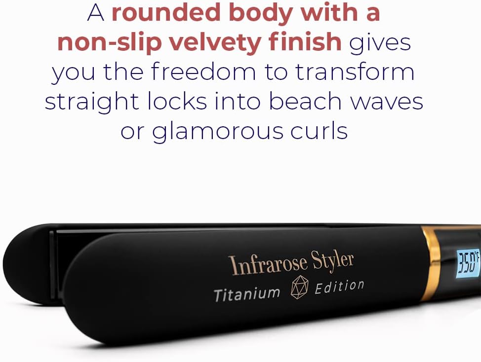 About this item Say goodbye to bad hair days! Our high-quality titanium plates make it effortless to get silky, straight hair in one pass - great for all hair types, no snagging or pulling! Get beach waves or elegant curls with ease! Our curved titanium styler is designed for any occasion, with advanced technology for long-lasting results. Short on time Our titanium styler heats up to 450°F in 30 sec, so you can get your hair looking fabulous in no time! Our LED display lets you control the temperature, so you can achieve the perfect look every time. Easy to read and use! Shop with confidence! Every purchase comes with a 1-year warranty and 60-day money-back guarantee. Try it risk-free and get peace of mind today. See more product details,Say goodbye to bad hair days! Our high-quality titanium plates make it effortless to get silky, straight hair in one pass - great for all hair types, no snagging or pulling!,Get beach waves or elegant curls with ease! Our curved titanium styler is designed for any occasion, with advanced technology for long-lasting results,Short on time Our titanium styler heats up to 450°F in 30 sec, so you can get your hair looking fabulous in no time!,Our LED display lets you control the temperature, so you can achieve the perfect look every time. Easy to read and use!,Shop with confidence! Every purchase comes with a 1-year warranty and 60-day money-back guarantee. Try it risk-free and get peace of mind today