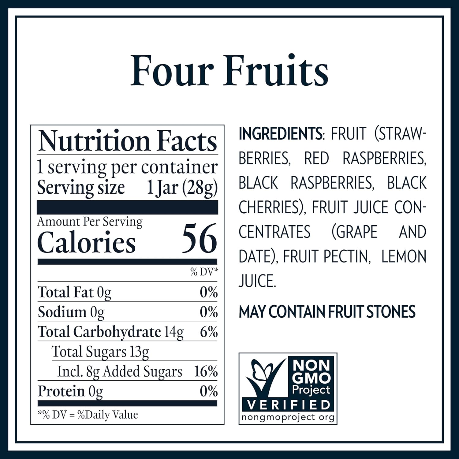Four Fruits: Perfectly balanced with lush notes of cherries, red raspberries, blackberries and strawberries. Pairs well with waffles, vanilla yogurt and English muffins