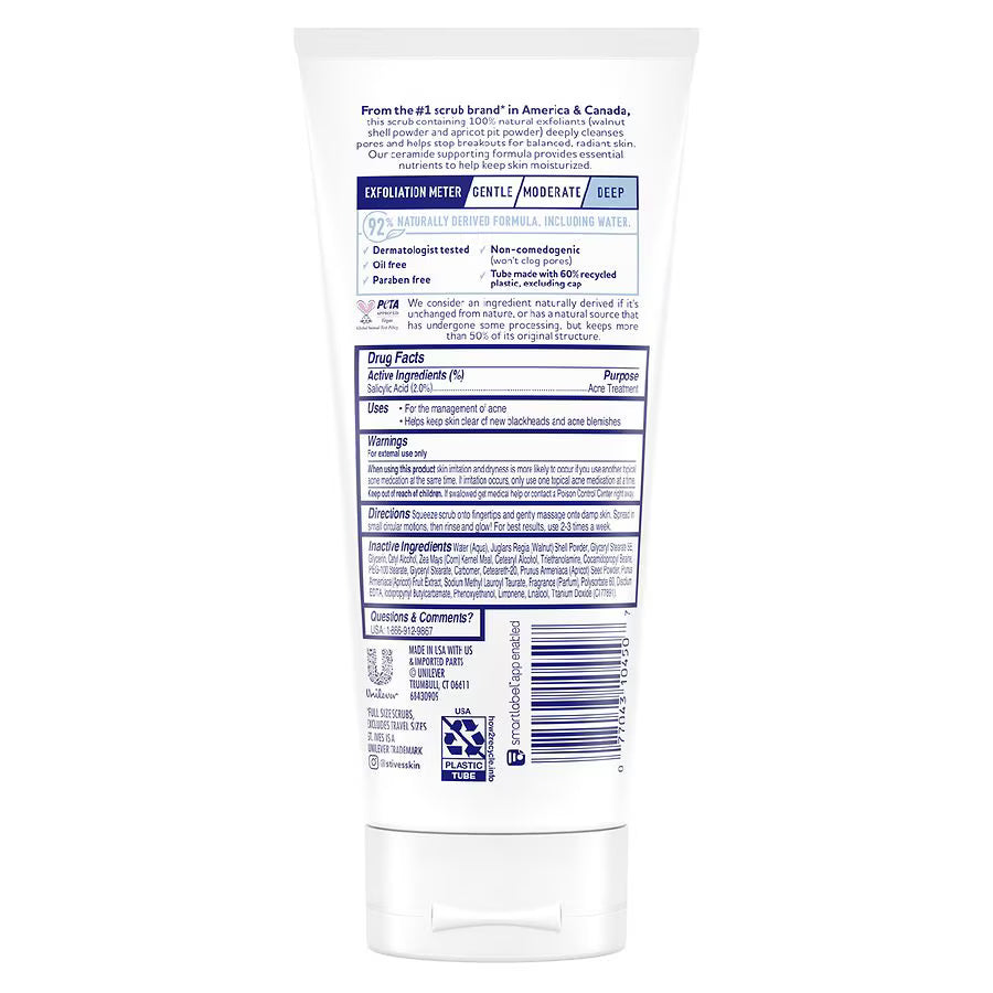 Bye-bye blemishes! From America's #1 scrub brand*, St. Ives Apricot Acne Control Face Scrub contains 100% natural walnut shell powder to deeply exfoliate for glowing skin. The 2% salicylic acid in this scrub helps prevent acne and can also help tackle 'maskne' (acne caused by protective face masks). Adding this deep cleaning face scrub to your routine along with replacing and washing your protective face masks frequently are some ways to help combat 'maskne.' This scrub also contains apricot fruit extract, which is known to help skin feel super soft and smooth. Apricots are our thing. Our apricots come from sun-drenched California and North Africa. Our walnuts are grown in orchards in California and harvested in the fall where the shells are finely milled and polished, so they only exfoliate the outer layers of dead skin cells. Just the way we like it. This scrub is dermatologist tested, paraben free, non-comedogenic (not tending to cause blocked pores), and oil free. And it's simple to use. Just squeeze a dime sized amount onto your fingertips and massage onto damp skin. Spread in small circular motions to wake your skin's natural circulation. When you're done, rinse and glow. For best results, use up to 3-4 times a week. St. Ives products are made with 100% natural moisturizers, exfoliants, and/or extracts to bring the joy of nature into our skin care products to give you soft, refreshed skin that glows. St. Ives does not test on animals anywhere in the world and is certified by PETA. When it comes to making you glow, St. believes that spending more time with nature can boost your happiness and have a serious de-stress effect of your mind, body and skin care. Learn more about our skin care products at STIVES.COM. Please reference product packaging for the latest ingredient list. *Full-sized scrubs only, excluding trial & travel.
