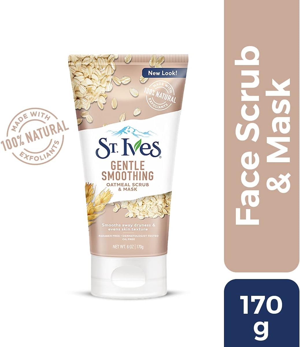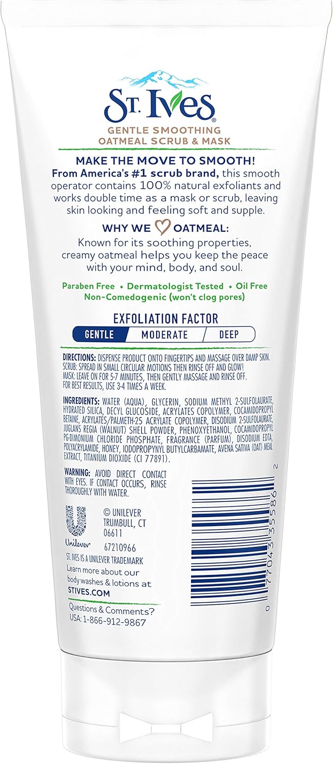 Product description Enter The Multitasker A Scrub And Mask In One Infused With The Soothing Scent Of Oatmeal And Honey, It Is Made With 100 Natural Exfoliants Like Walnut Shell Powder. A Gentle Peeling For Soft, Nourished Skin. 2 In 1 Derma Tested Warning Use As A Gentle Exfoliant To Smooth Skin Or Layer On Top Of A Mask For A Nourishing Treatment. Made From 100 Natural Walnut Shell Scrub, This Formula Is Gently Polished And Can Be Used 3 4 Times Per Week For Fresh, Glowing Skin With All The Added Extras. Good Old Oatmeal Is All Sorts Of Good Things. Our Oat Flour Comes From The Usa Of A. A Cool And Humid Climate Suits Those On The Ground. The Whole Oat Kernel Is Ground Into A Fine Powder. It Is Then Extracted With Water, Filtered And Distilled. And Don T Forget Our Honey... The Golden Nectar Is Known To Be A Natural Moisturizer And Can Soothe Dry, Itchy Skin. Our Honey Comes From The Hustle And Bustle Of The States Of North And South Dakota In The Usa. It Goes Through A Careful Extraction Process. Natural Ingredients Oatmeal Extract Honey Extract Walnut Shell Hydrated Powder Silica How To Use Squeeze A Dime Amount Of The Scrub Onto Your Fingertips And Massage Onto Damp Skin. Distribute In Small Circular Movements And Activate The Skin Natural Circulation With Gentle Pressure. Work Up To The Hairline And The Sides Of The Nose. When Finished, Rinse And Pat Dry With A Clean Towel. If Using A Mask, Leave It On For 5 7 Minutes, Then Massage Gently And Rinse With Water. Directions Squeeze a dime amount of the scrub onto your fingertips and massage onto damp skin. Distribute in small circular movements and activate the skin natural circulation with gentle pressure. Work up to the hairline and the sides of the nose. When finished, rinse and pat dry with a clean towel. If using a mask, leave it on for 5-7 minutes, then massage gently and rinse with water,It 2 In 1 A Gentle Exfoliating Face Scrub To Soften And Smooth Away Dryness And A Mask To Instantly Nourish Skin,Made with 100 natural exfoliants,Product type: SKIN_EXFOLIANT,Brand: ST Ives