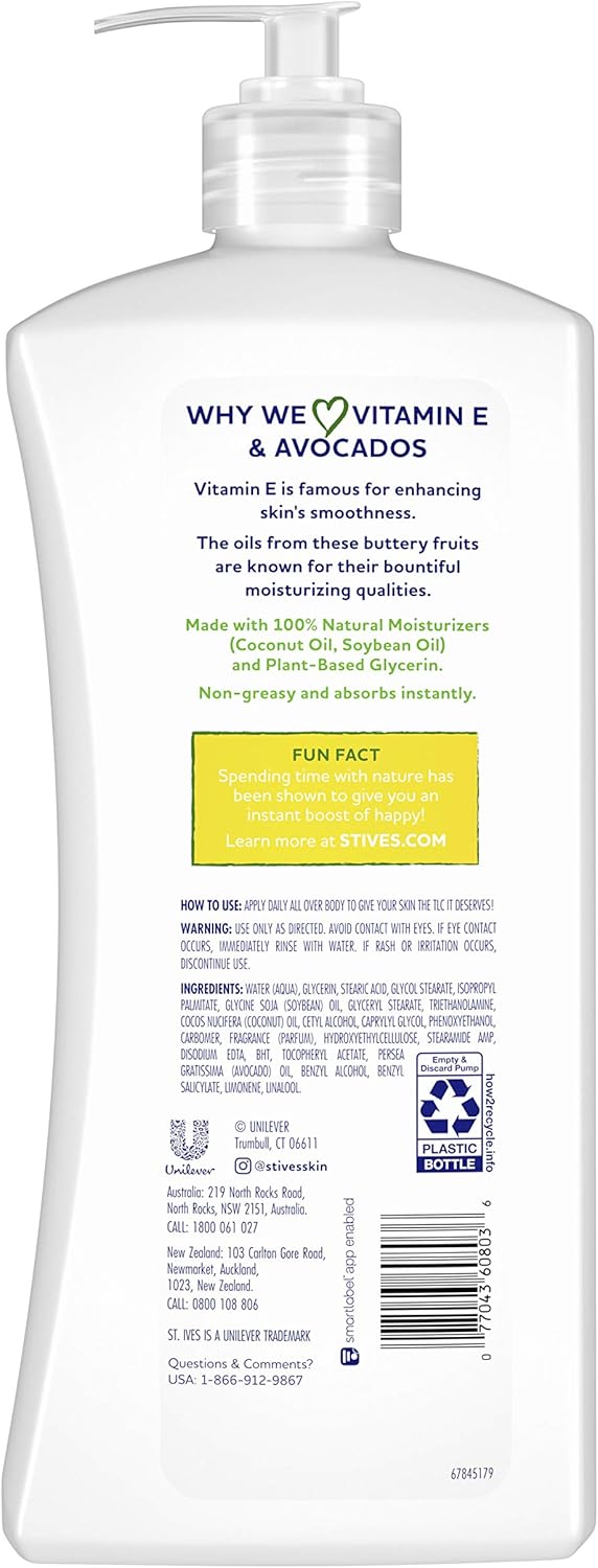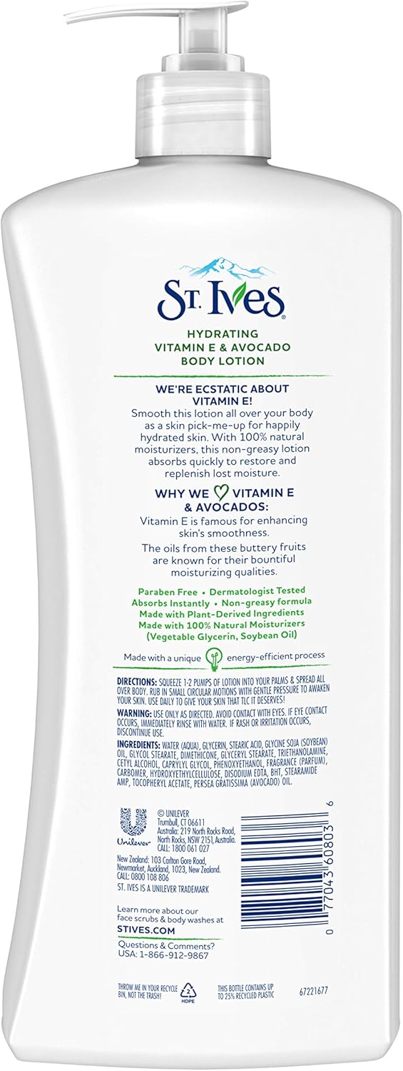 For the most up to date information, we recommend you visit the manufacturer website for the best product details, including ingredients, hazards, directions and warnings. This product offering is for 4 Retail Package,Our Hydrating Vitamin E and Avocado Body Lotion replenishes lost moisture for hydrated, healthy-looking skin. Great for both dry hands and body,Lotion made with 100 percent natural moisturisers - soybean oil and plant-based glycerin., Smooth this lotion all over your body as a skin pick-me-up for happily hydrated skin. With 100 percent natural moisturizers, this non-greasy lotion absorbs quickly to restore and replenish lost moisture,The avocados in this hand and body lotion formula come from South Africa, Kenya and Mexico,Vitamin E is famous for enhancing skin's smoothness, and the oils from avocados are known for their bountiful moisturizing qualities a perfect combination for dry skin,This lotion is paraben-free, dermatologist tested, absorbs instantly, and is made with plant-derived ingredients. Each bottle contains up to 25 percent recycled plastic. Be sure to recycle upon disposal