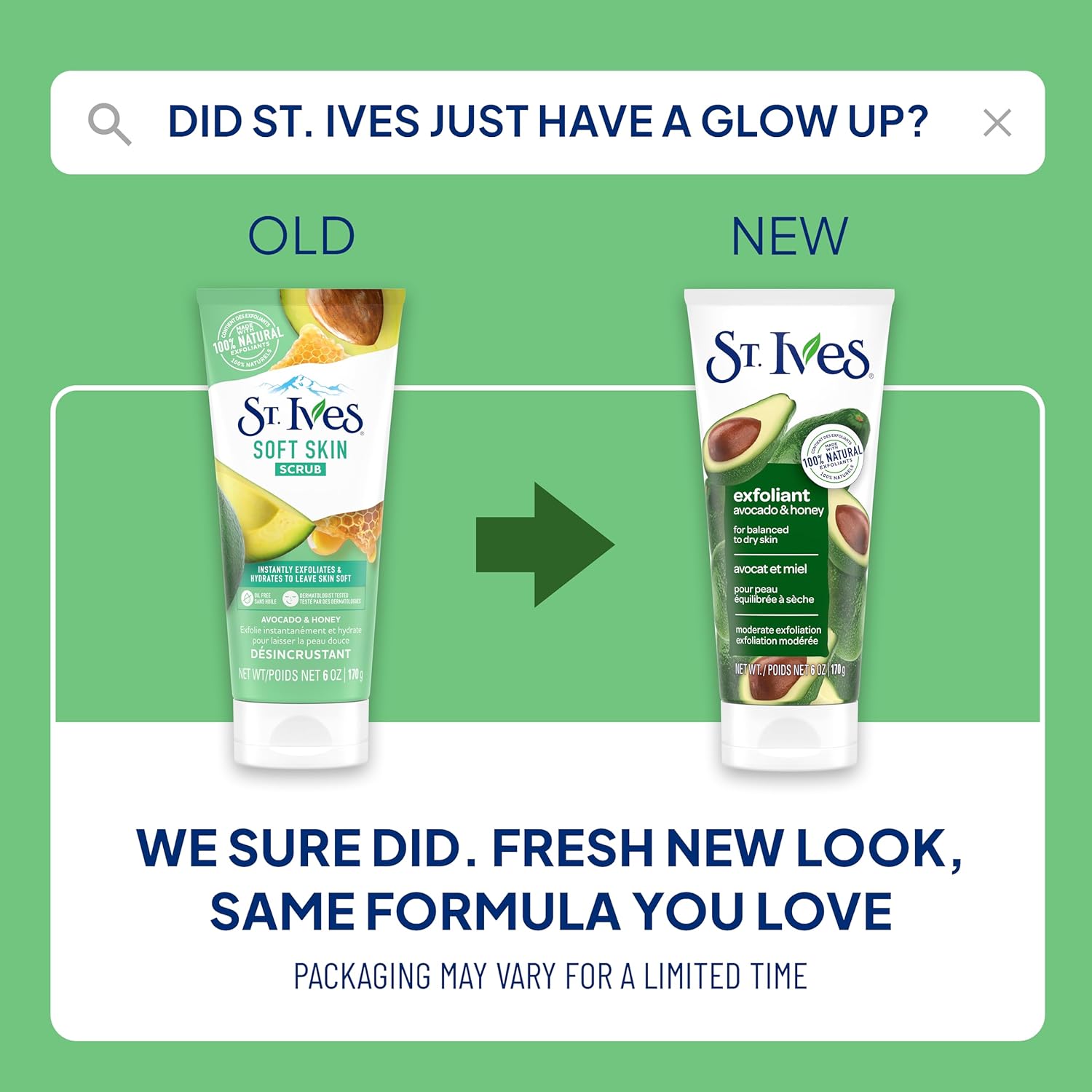 REVEAL SOFT, SMOOTH SKIN: St. Ives Soft Skin Face Scrub Honey & Avocado, made with 100% Natural Honey and Avocado Extract, instantly exfoliates and hydrates to leave skin soft