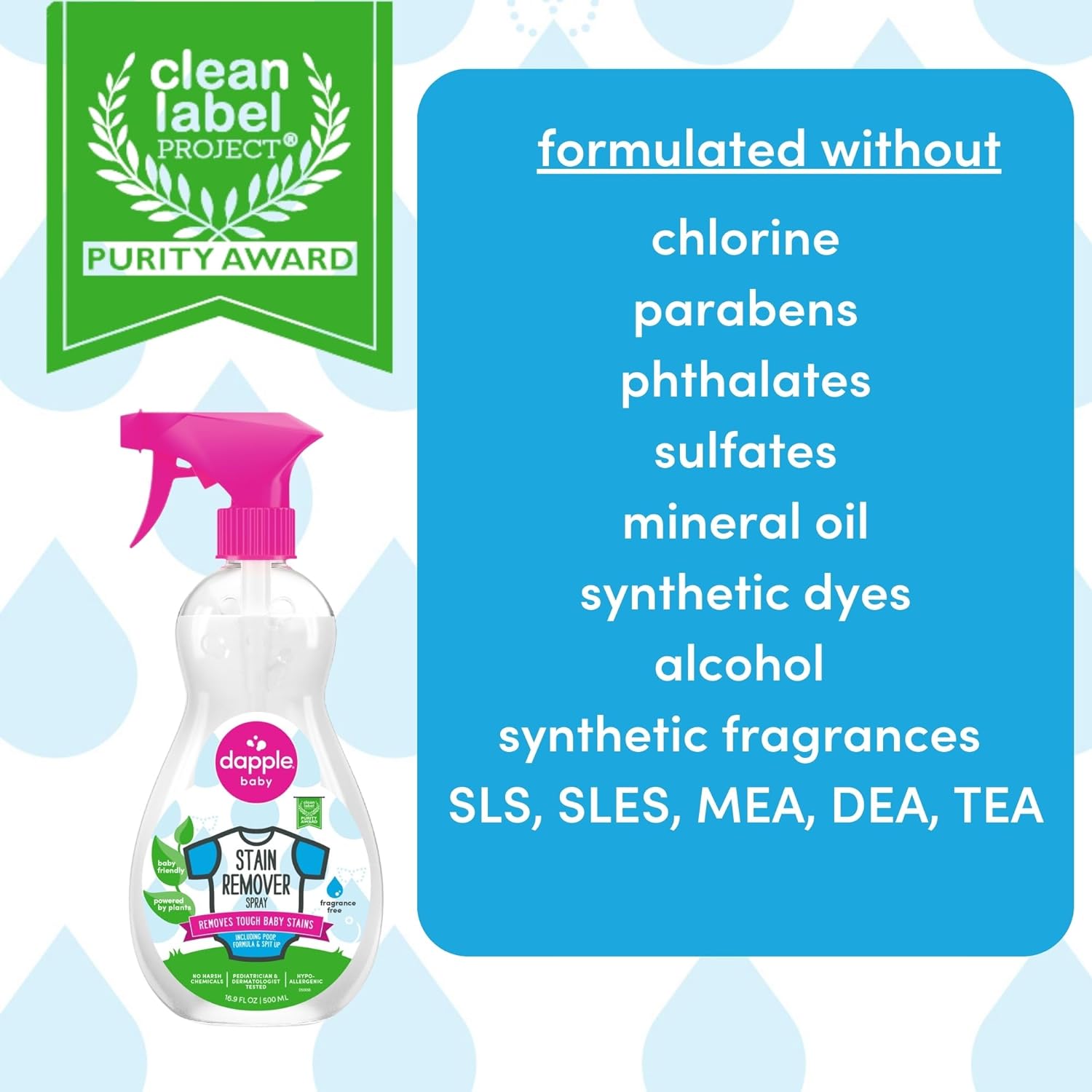 SAFE & EFFECTIVE STAIN REMOVER SPRAY: Use Dapple Stain Remover Spray with baby laundry detergent in your laundry room; It's gentle for fabrics that touch baby's delicate skin, but effective for the whole family10EFFECTIVE & POWERFUL PLANT-BASED CLEANING: Powered by plants to work on a variety of stains, especially tough baby laundry stains like poop, formula and spit-up compared to leading brands10VERSATILE & BABY FRIENDLY: This baby laundry stain remover works well on stains made by babies, toddlers and the entire family; Suitable for sensitive skin and cloth diapers10CLEAN, PURE & MINDFUL INGREDIENTS: Pediatrician and dermatologist tested, hypoallergenic, plant-based and made without harsh chemicals, parabens, sulfates, phthalates, mineral oil, synthetic dyes and fragrances, chlorine, alcohol, SLS, SLES, MEA, DEA, TEA10FRAGRANCE FREE: Made without added fragrance