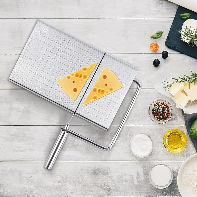 Stainless Steel Cheese Cutter β Durable Wire Cheese Slicer with 6 Replacement Wires, Multipurpose Butter, Sausage & Ham Cutting Board