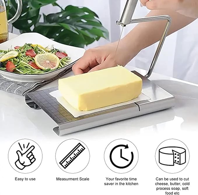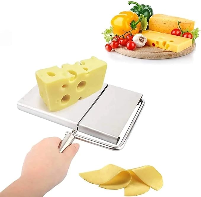 Effortlessly slice and serve your favorite cheeses with this Stainless Steel Cheese Cutter. Designed for precision and durability, it features a high-quality wire slicer and comes with 6 replacement wires for long-lasting use. Beyond cheese, this versatile tool is perfect for butter, sausages, ham, and other soft foods, making it a multipurpose addition to your kitchen. The sturdy cutting board provides a stable surface while ensuring safety and ease of use. Sleek, practical, and durable, this cheese slicer is ideal for everyday meals, entertaining, or gifting to culinary enthusiasts