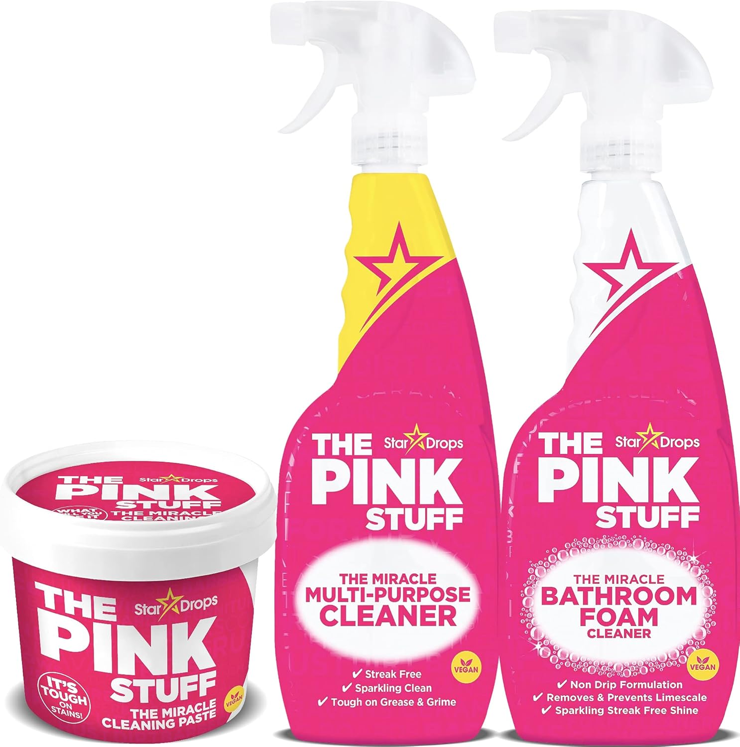 The Pink Stuff Miracle Multi-Purpose Cleaning Spray - Our Versatile Multi-Purpose Cleaner Spray For Hard Surfaces Is Tough On Stains, Penetrates And Removes Grease And Grime, Leaving Shiny Clean Results. The Miracle Cleaning Paste - The Pink Stuff Cleaning Paste, Established In 1938, Is A Versatile, Specialty-Formulated, Vegetable Oil Based Cleaner For Use Both Inside And Outside The Home. The Miracle Foam Bathroom Cleaner - Our Versatile Bathroom Non Drip Foam Cleaner, Clings To Surfaces, Penetrants And Removes Dirt, Grease And Grime, Removes And Prevents Limescale Leaving Shiny Clean Results