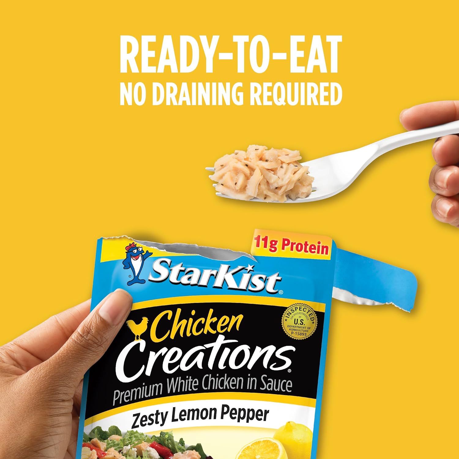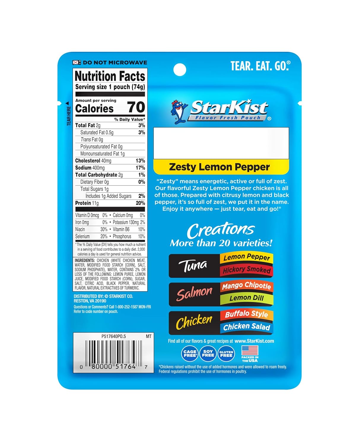 DELICIOUS FLAVOR: “Zesty” means energetic, active or full of zest. And our flavorful StarKist Zesty Lemon Pepper Chicken Creations, prepared with citrusy-lemon and black pepper, is so full of zest, we put it in the name10GOOD SOURCE OF LEAN PROTEIN: Our Chicken Creations Pouch is made with premium white chicken, raised on American farms and packed in the USA. It has 12g of protein and 70 calories per pouch. Plus, it’s soy free and gluten free10ADD VARIETY TO YOUR DIET: StarKist Chicken Creations Zesty Lemon Pepper is a wholesome choice for a snack or meal. It’s perfect on a Greek salad, cucumber slices or straight from the pouch. Works with Keto, Mediterranean, and Weight Watchers diet plans10FLAVOR FRESH POUCH: Our flavor fresh, ready to eat chicken pouch preserves the freshness of your favorite meal or snack, so it’s always delicious and ready when you are. There’s no can opener required or draining necessary – just tear, eat and go!10BULK 12 PACK: Buy your chicken in bulk with the StarKist 12-Pack. These StarKist Chicken Creations Zesty Lemon Pepper pouches are easy to store and great to have handy for when hunger strikes – whether you’re on the go, at the office or at home10Whether you’re squeezing in lunch between meetings during a busy workday or want a quick, protein-packed snack between soccer practice, school and other daily errands, StarKist Chicken Creations Zesty Lemon Pepper pouch is the perfect choice! This 2.6 oz pouch starts with our premium white chicken and is the perfect addition to salads, sandwiches, pasta or even straight out of the pouch. Plus, this nutrient dense chicken pouch is soy free, gluten free and works well with Keto, Mediterranean and Weight Watchers diet plans! Our flavor fresh chicken pouch preserves the freshness of your favorite meal or snack, so it’s always delicious and ready when you are. There’s no can opener required or draining necessary – just tear, eat and go! This ready-to-eat chicken is a good source of lean protein. It has 12g of protein and 70 calories per pouch. Plus, the pouches are easy to store, so you can stock up with this 12-Pack, and keep these chicken singles in your office, pantry at home and even in your diaper bag or car! An industry innovator, StarKist was the first brand to introduce StarKist single-serve pouch products, which include Tuna, Salmon and Chicken Creations, and StarKist Selects E.V.O.O. As America’s favorite tuna*, StarKist represents a tradition of quality, consumer trust and a commitment to sustainability. *Nielsen Custom Scantrak Data xAOC Dollar Share Latest 52 Weeks