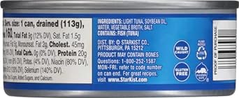 DELICIOUS, MILD FLAVOR: StarKist Chunk Light Tuna in Oil features wild caught tuna packed in a mild tasting oil that enhances the flavor people have come to expect from StarKist. It’s perfect for quick snacks or meals on the go10EXCELLENT SOURCE OF PROTEIN: Our tuna is a natural source of protein and Omega 3s, plus it has 20g of protein, 160 calories per serving. It’s gluten free and works well with Keto, Paleo, Mediterranean and Weight Watchers diet plans10ADD VARIETY TO YOUR DIET: Tuna is a wholesome choice for a snack or meal that fits into an active lifestyle. StarKist tuna in oil is a great and easy way to add seafood to your diet10VERSATILE: StarKist Chunk Light Tuna in oil is a versatile and easy way to liven up a meal. It can be used in cool tuna salads, hot casseroles, on sandwiches, and even eaten on its own as a snack or meal10EASY TO STORE: This tuna can is easy to store and great to have handy for when hunger strikes – whether you’re on the go, at the office or at home10Whether you’re squeezing in lunch between meetings during a busy workday or want a quick, protein-packed and nutrient dense snack between soccer practice, school and other daily errands, StarKist Chunk Light Tuna in Oil is the perfect choice! These 5 oz. cans contain wild caught tuna packed in a mild tasting oil that enhances the flavor people have come to expect from StarKist. This chunk light tuna is ideal for both quick snacks and as part of a larger meal. It’s gluten free and works well with Keto, Paleo, Mediterranean and Weight Watchers diet plans! This tuna is an excellent, natural source of protein and Omega 3s, and it has 20g of protein and 160 calories per serving. Plus, it’s a great, quick and easy way to add seafood to your diet! Plus, they are easy to store, you can stock up and keep these tuna cans in your office, pantry at home and even in your diaper bag or car! An industry innovator, StarKist was the first brand to introduce StarKist single-serve pouch products, which include Tuna, Salmon and Chicken Creations, and StarKist Selects E.V.O.O. As America’s favorite tuna*, StarKist represents a tradition of quality, consumer trust and a commitment to sustainability. *Nielsen Custom Scantrak Data xAOC Dollar Share Latest 52 Weeks