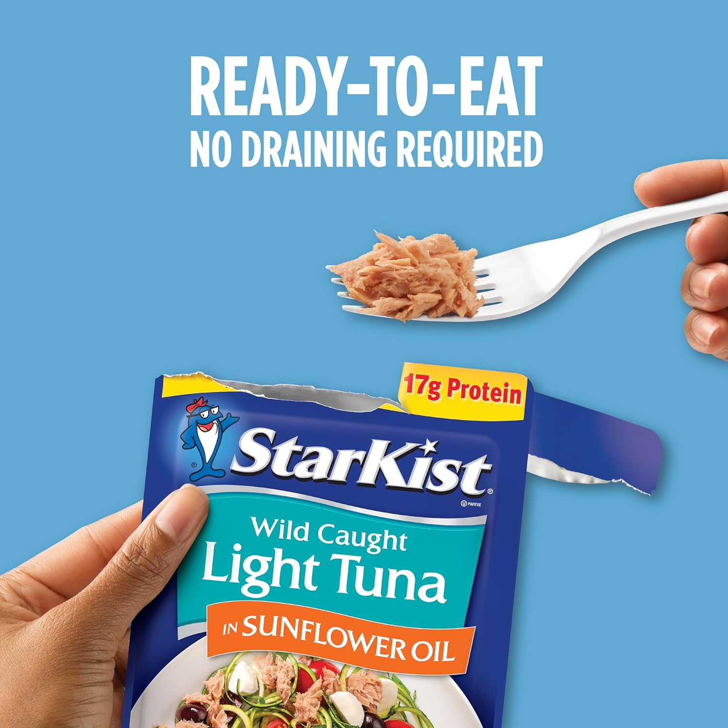 DELICIOUS, MILD FLAVOR: StarKist Chunk Light Tuna in Sunflower Oil is wild caught and dolphin safe. Each of our nutrient dense tuna packs contains 100% all-natural chunk light tuna that is perfect for quick snacks or meals on the go10EXCELLENT SOURCE OF PROTEIN: Our tuna is a natural source of protein and Omega 3s, plus it has 17g of protein, 150 calories per serving. It’s soy free, gluten free and works well with Keto, Paleo, Mediterranean and Weight Watchers diet plans!10ADD VARIETY TO YOUR DIET: Tuna is a wholesome choice for a snack or meal that fits into an active lifestyle. StarKist tuna in sunflower oil is a great and easy way to add seafood to your diet10FLAVOR FRESH POUCH: Our flavor fresh tuna pouch preserves the freshness of your favorite meal or snack, so it’s always delicious and ready when you are. There’s no can opener required or draining necessary – Just tear, eat and go!10BULK 24 PACK: Buy your tuna in bulk with the StarKist 24-Pack. These tuna pouches are easy to store and great to have handy for when hunger strikes – whether you’re on the go, at the office or at home10Whether you’re squeezing in lunch between meetings during a busy workday or want a quick, protein-packed and nutrient dense snack between soccer practice, school and other daily errands, StarKist Chunk Light Tuna in Sunflower Oil is the perfect choice! These 2.6 oz pouches contain hand packed, select cuts of premium, wild caught, delicious tuna with a mild flavor. The 100% all-natural chunk light tuna packs are ideal for both quick snacks and as part of a larger meal. It’s soy free and gluten free and works well with Keto, Paleo, Mediterranean and Weight Watchers diet plans! Our flavor fresh tuna to go pouch preserves the freshness of your favorite meal or snack, so it’s always delicious and ready when you are. There’s no can opener required or draining necessary – just tear, eat and go! This packaged tuna is an excellent, natural source of protein and Omega 3s, and it has 17g of protein and 150 calories per pouch. Plus, it’s a great, quick and easy way to add seafood to your diet! Tuna is a wholesome way to add variety to your meals. Easy to store, you can stock up with this 24-Pack, and keep these tuna singles in your office, pantry at home and even in your diaper bag or car! An industry innovator, StarKist was the first brand to introduce StarKist single-serve pouch products, which include Tuna, Salmon and Chicken Creations, and StarKist Selects E.V.O.O. As America’s favorite tuna*, StarKist represents a tradition of quality, consumer trust and a commitment to sustainability. *Nielsen Custom Scantrak Data xAOC Dollar Share Latest 52 Weeks