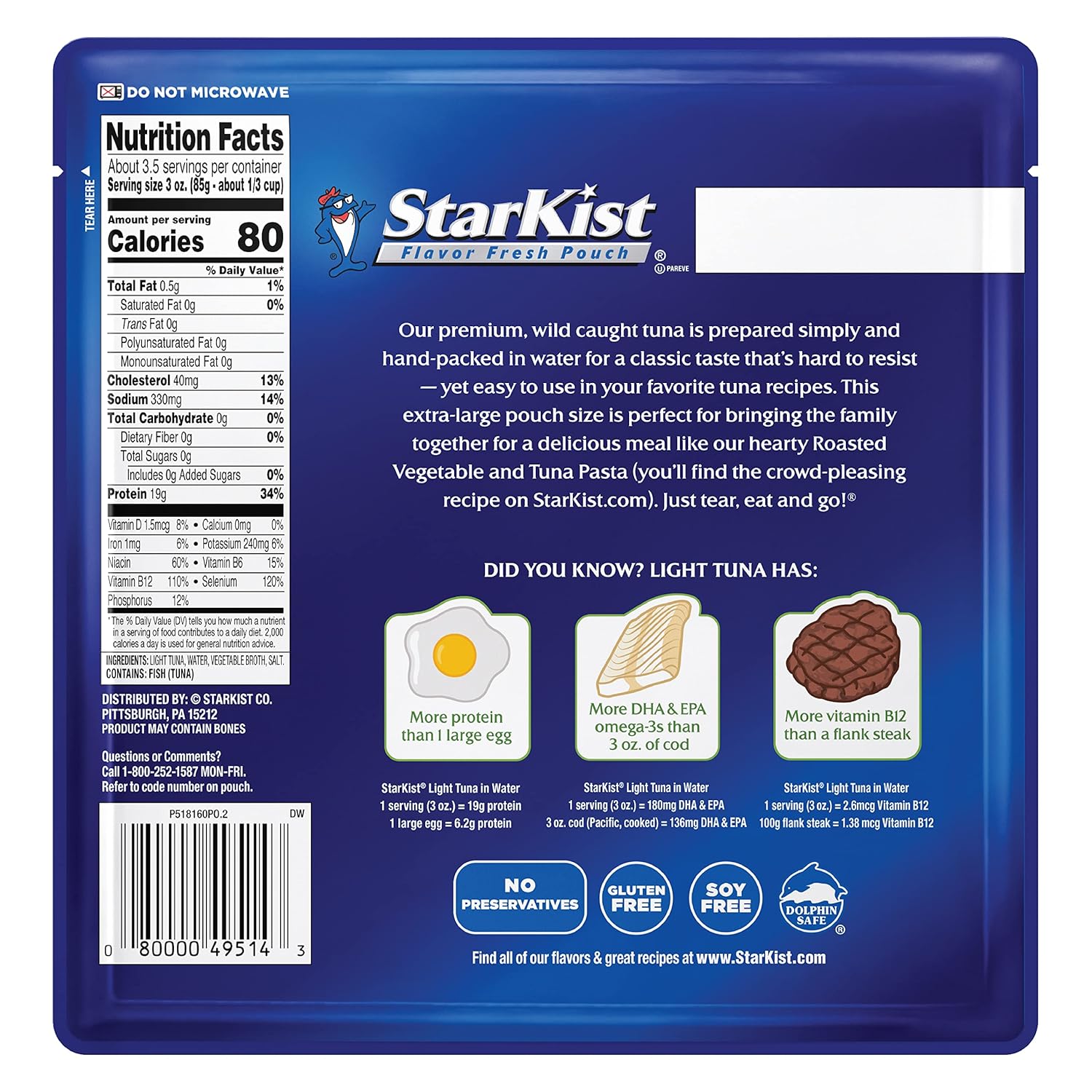 DELICIOUS, MILD FLAVOR: StarKist Chunk Light Tuna in Water is wild caught and dolphin safe. Each of our convenient, family-sized, nutrient dense tuna pouches contains 100% all-natural chunk light tuna that is perfect for quick snacks or meals on the go10EXCELLENT SOURCE OF PROTEIN: Our tuna is a natural source of protein and Omega 3s, plus it has 19g of protein, 80 calories per serving. It’s soy free, gluten free and works well with Keto, Paleo, Mediterranean and Weight Watchers diet plans10ADD VARIETY TO YOUR DIET: StarKist Chunk Light Tuna in water is a wholesome choice for a snack or meal that fits into an active lifestyle. Because no draining is required, it’s perfect to enjoy in tuna salad sandwiches and casseroles10FLAVOR FRESH POUCH: Our flavor fresh tuna pouch preserves the freshness of your favorite meal or snack, so it’s always delicious and ready when you are. There’s no can opener required or draining necessary – just tear, eat and go10BULK 12 PACK: Buy your tuna in bulk with the StarKist 12-Pack. These tuna pouches are easy to store and great to have handy for when hunger strikes – whether you’re on the go, at the office or at home10Whether you’re squeezing in lunch between meetings during a busy workday or want a quick, protein-packed and nutrient dense snack between soccer practice, school and other daily errands, StarKist Chunk Light Tuna in Water is the perfect choice! These 11 oz. family-sized pouches contain wild caught, delicious tuna with a mild flavor. The 100% all-natural chunk light tuna pouches are ideal for both quick snacks and as part of a larger meal. It’s soy free, gluten free and works well with Keto, Paleo, Mediterranean and Weight Watchers diet plans! Our flavor fresh tuna to go pouch preserves the freshness of your favorite meal or snack, so it’s always delicious and ready when you are. There’s no can opener required or draining necessary – just tear, eat and go! This family-sized tuna pouch is an excellent, natural source of protein and Omega 3s, and it has 19g of protein and 80 calories per serving. Plus, it’s a great, quick and easy way to add seafood to your diet! Easy to store, you can stock up with this 12-pack and keep these family-style tuna pouches at home when hungry strikes. An industry innovator, StarKist was the first brand to introduce StarKist single-serve pouch products, which include Tuna, Salmon and Chicken Creations, and StarKist Selects E.V.O.O. As America’s favorite tuna*, StarKist represents a tradition of quality, consumer trust and a commitment to sustainability. *Nielsen Custom Scantrak Data xAOC Dollar Share Latest 52 Weeks